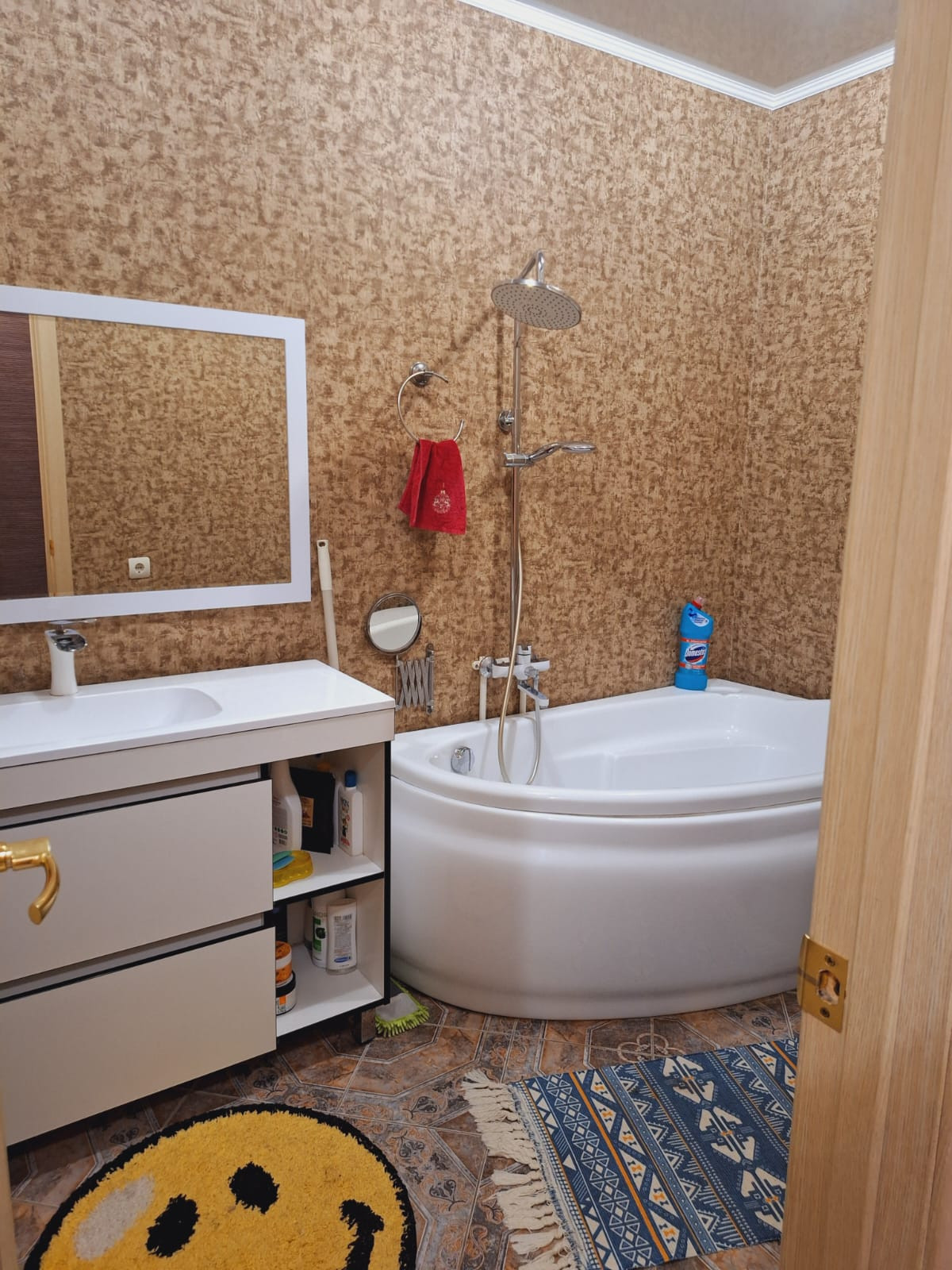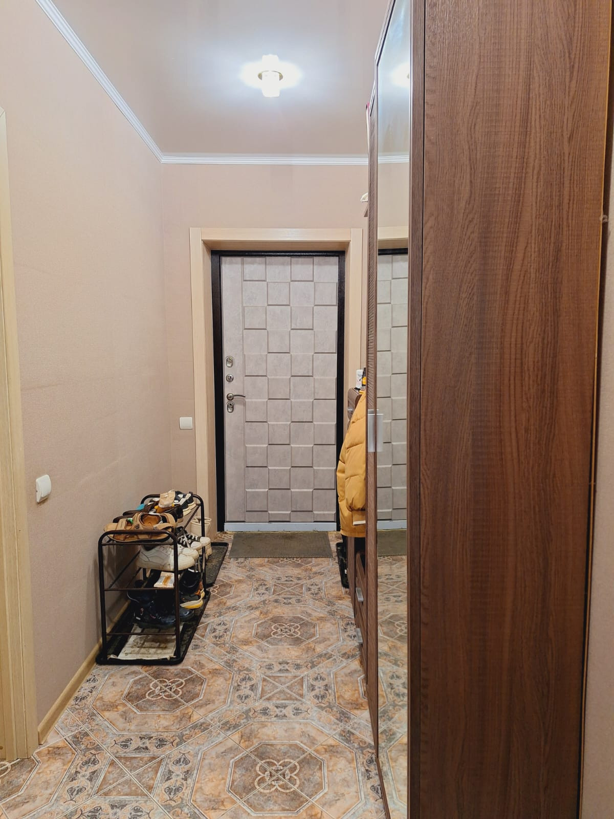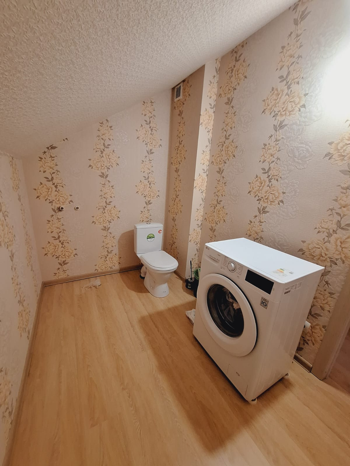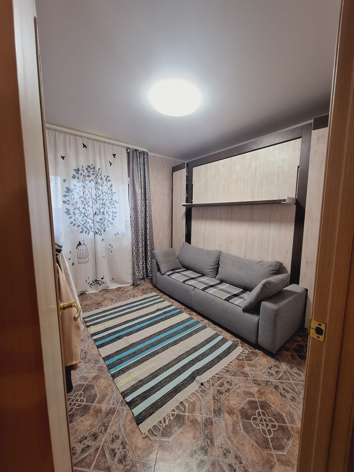 Потолок натяжной, полы кафель, стены выровнены