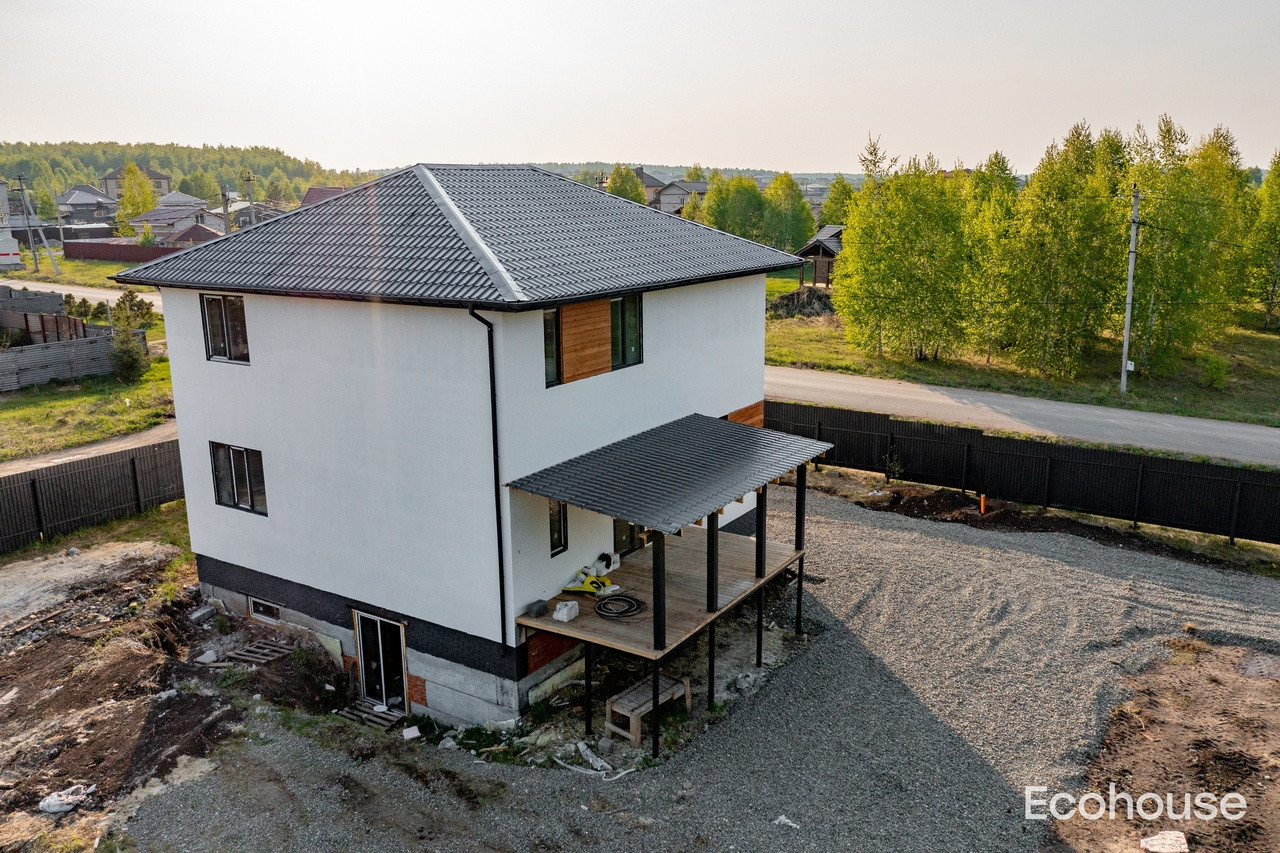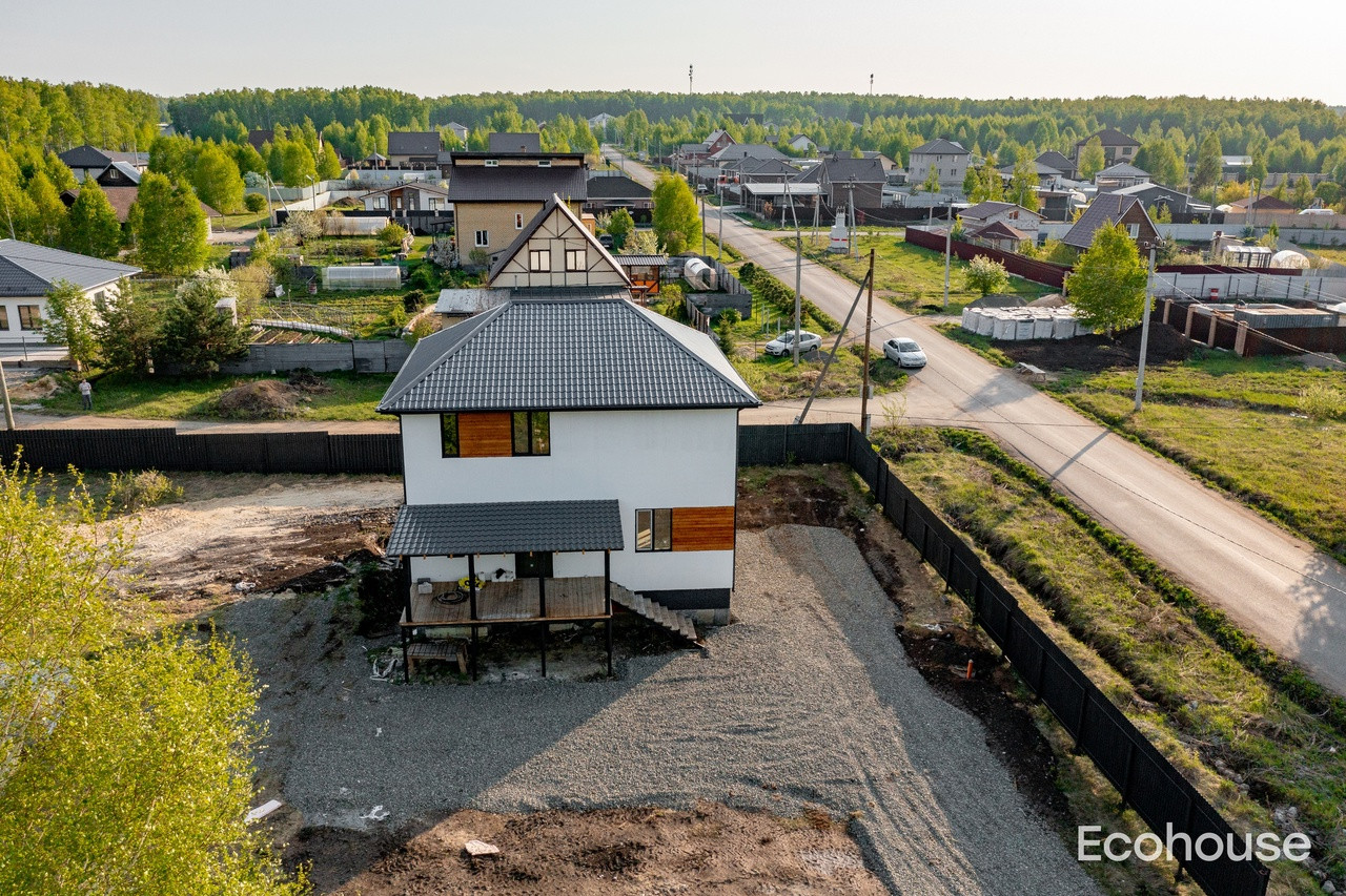 В доме расположилась большая кухня-гостиная, 4 спальни, 2 санузла и гардероб. А также цокольный этаж, который можно оборудовать под жилой или другие цели.