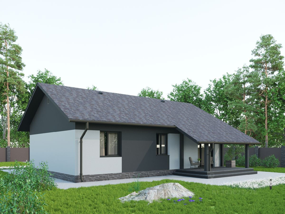 Одноэтажный каменный дом комфорт  класса с жилой площадью 87 кв.м., выполненный в классическом стиле с двухскатной крышей, двумя крытыми террасами. Оштукатуренный фасад или облицовка клинкерным кирпичом.