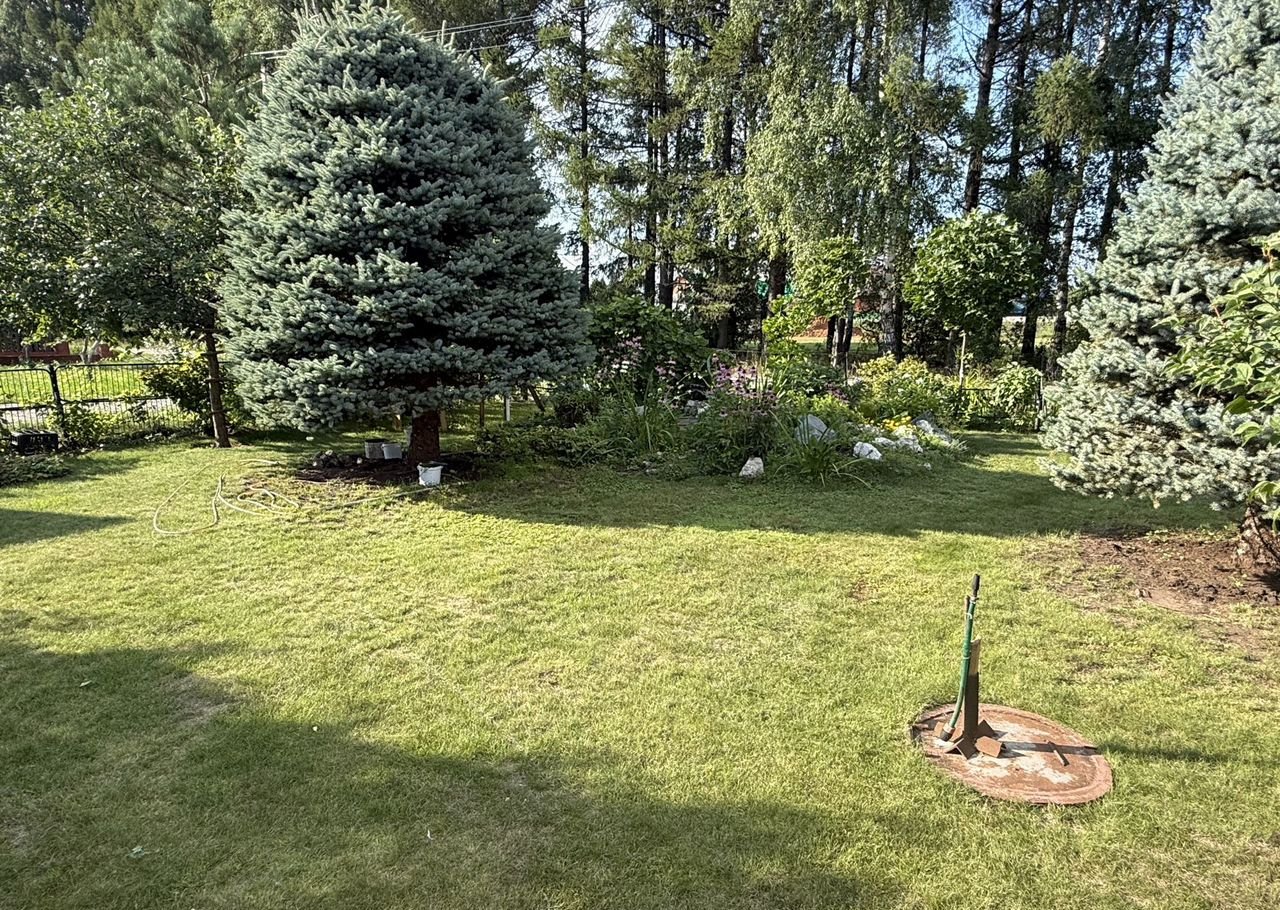 - С северной стороны благоустроенный сад с декоративными и плодовыми насаждениями, газоном, цветником, качелями и декоративным бассейном. Яблоня (зимний сорт Спартан), туя, стелющаяся ель, розы, пионы и клематис