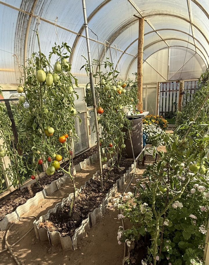 - На территории имеется две теплицы, одна из которых отапливаемая и с искусственным светом для ранней высадки овощей и зелени. Стены теплицы из стекла, крыша из профнастила. Также имеется переносной парник с возможностью открывания со всех сторон