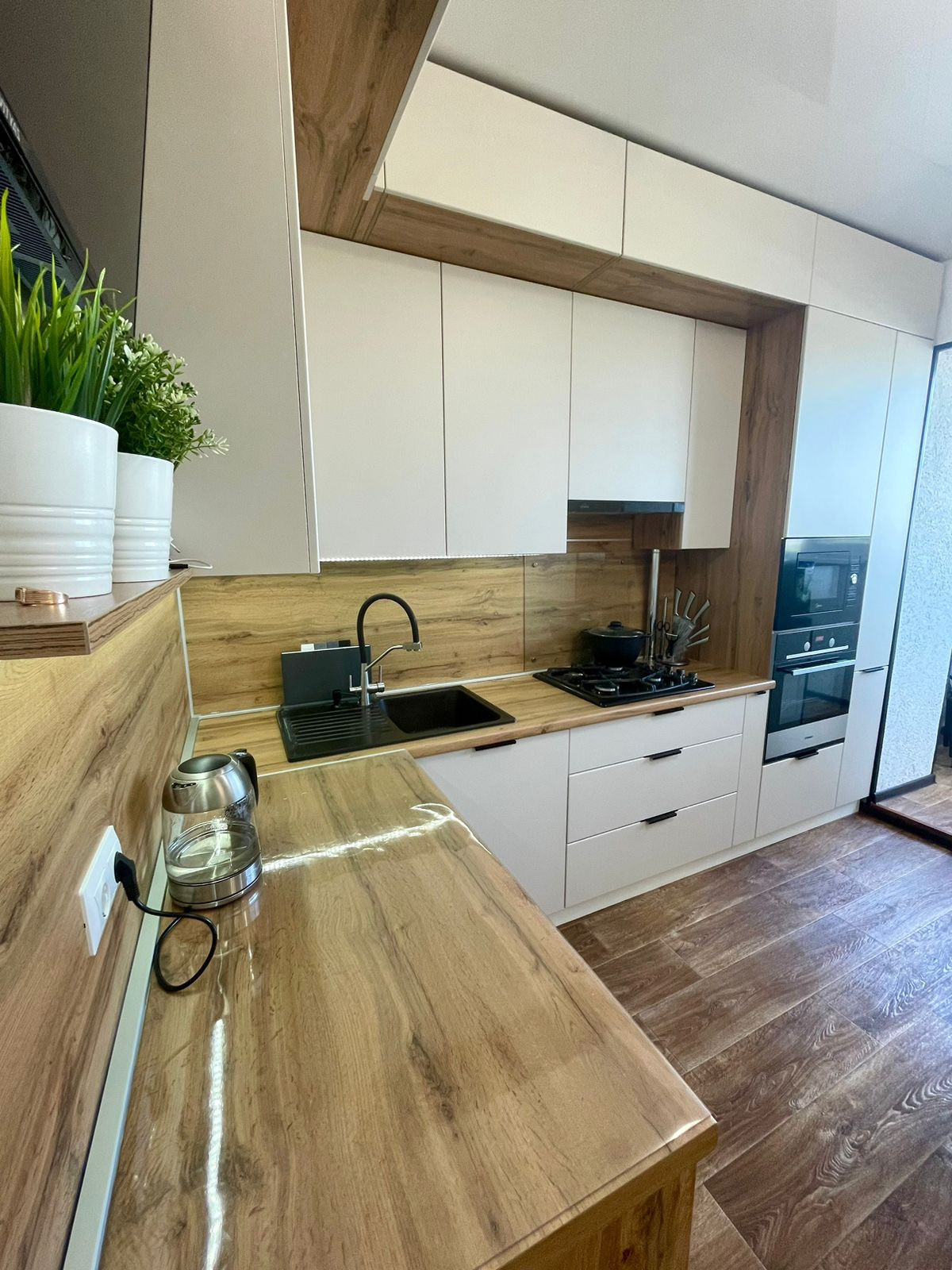 Кухня совмещенная с лоджией 14,5 квадратных метров со встроенным гарнитуром, новым хозяевам остается варочная поверхность, вытяжка, кондиционер, 3 вместительных встроенных шкафа ( прихожая, комната, зал).