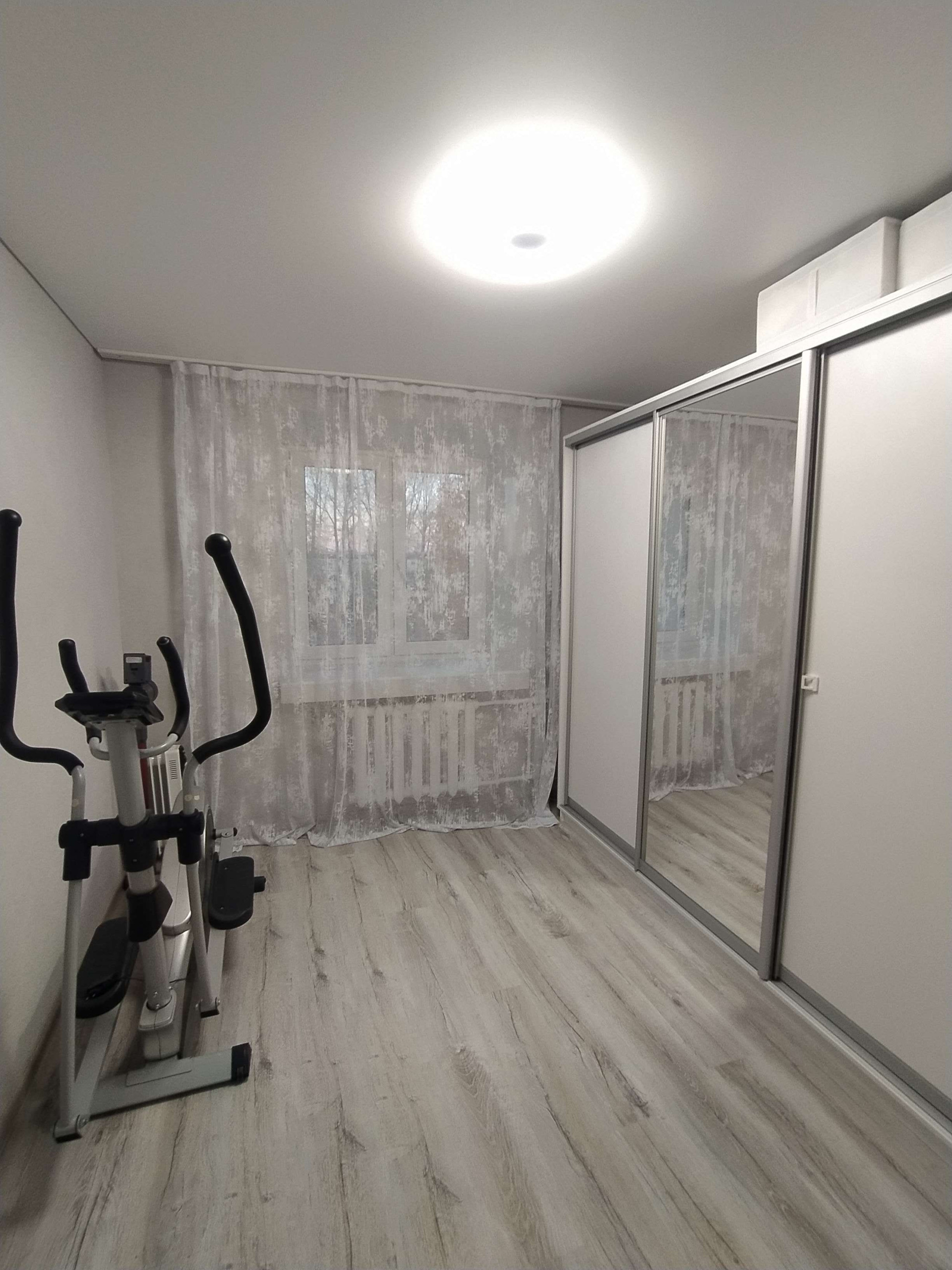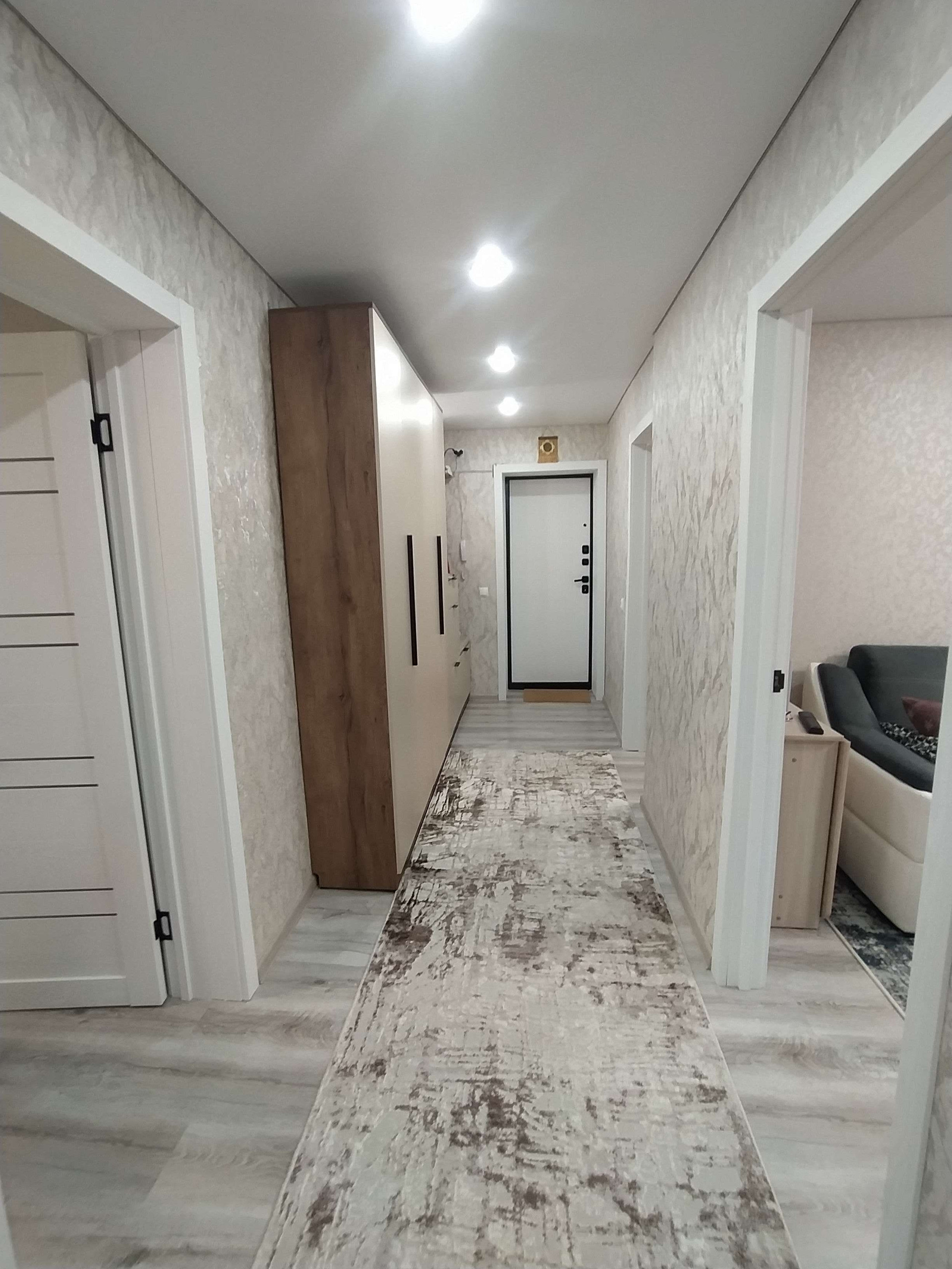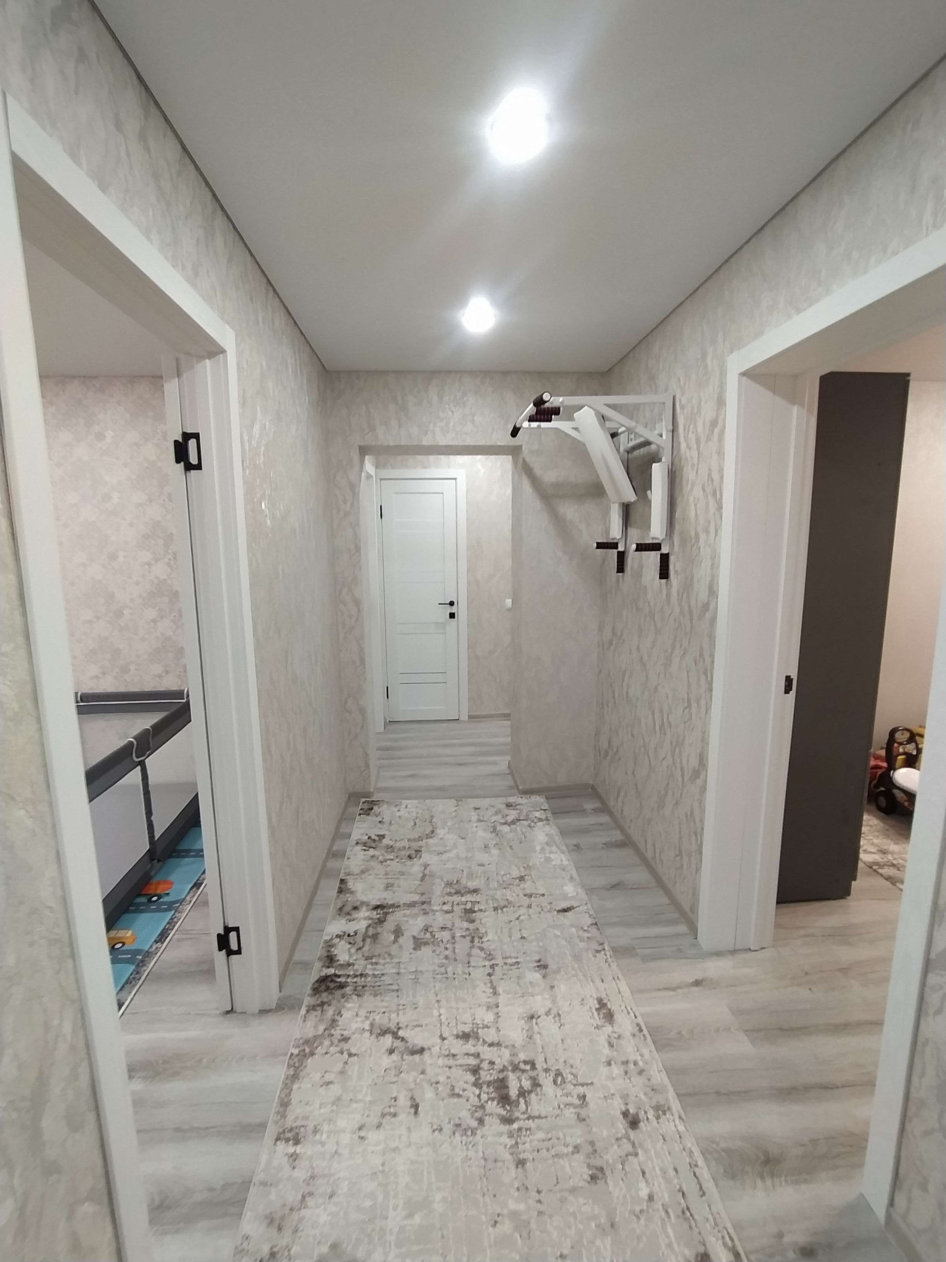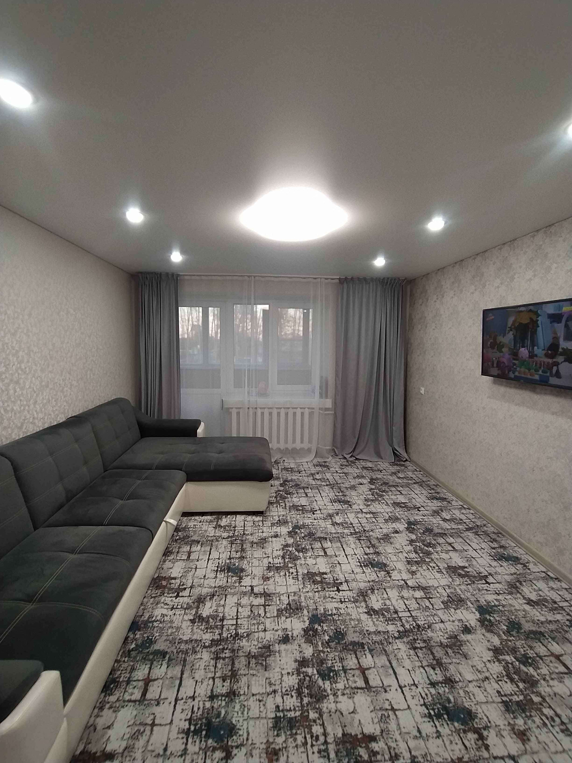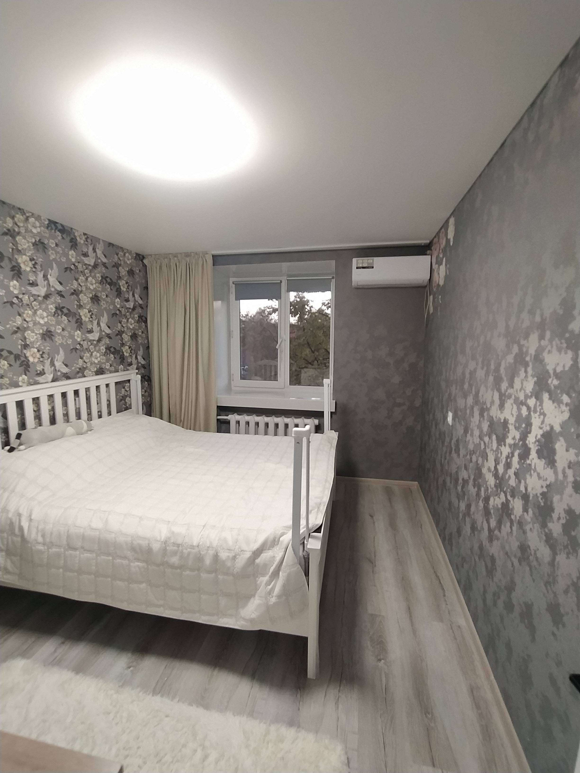 Евро ремонт в светлых тонах: натяжные потолки с точечной подсветкой, светлый ламинат 33 класса, новые стильные обои во всех комнатах, раздельный санузел в кафельной плитке.