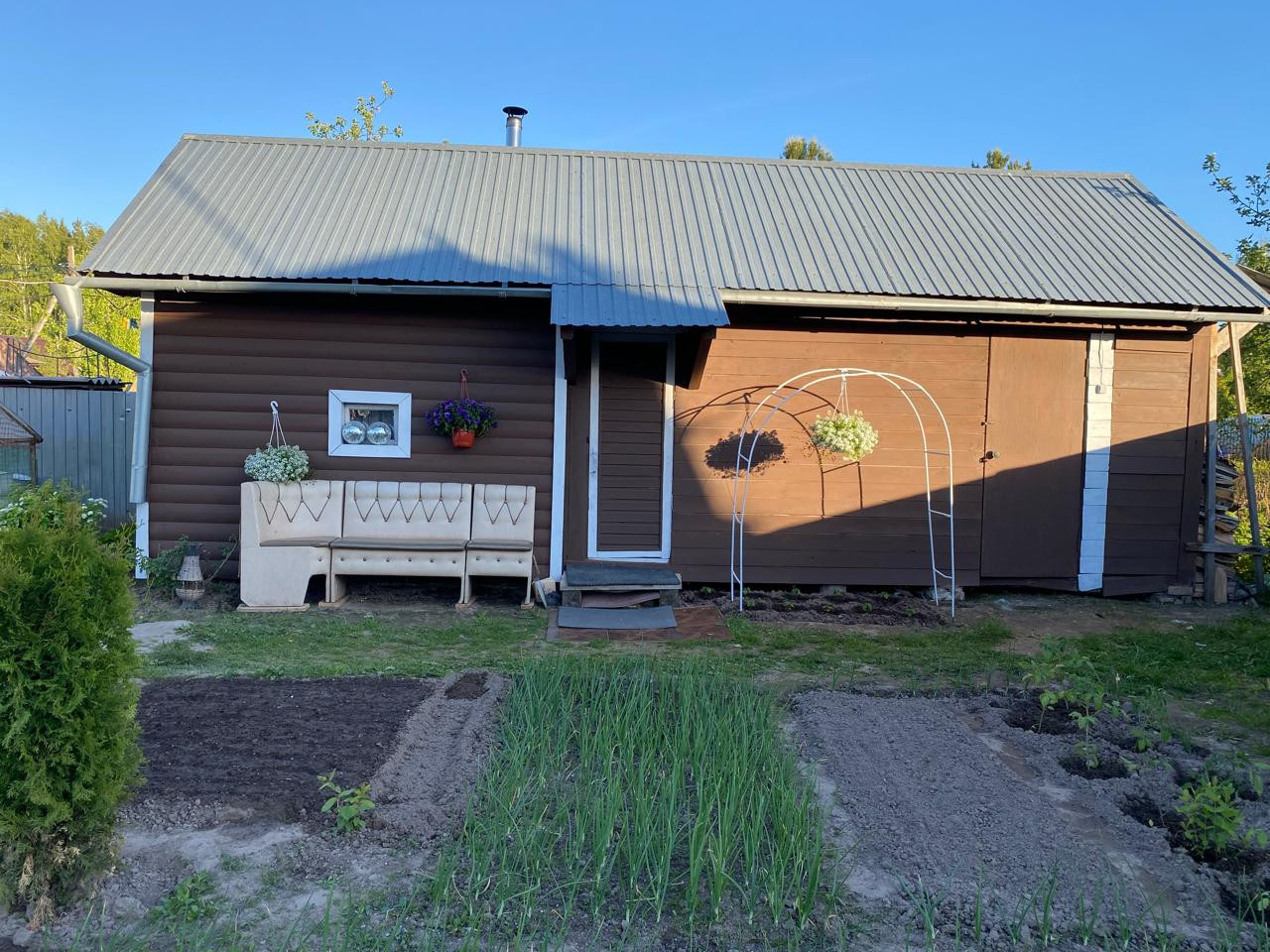 Участок ровный (не затапливаемый). Огорожен по периметру забором из профнастила. На участке отдельно стоящая баня, сарай, доп.санузел, теплица. Посажены плодовые деревья и кустарники, земля плодородная.