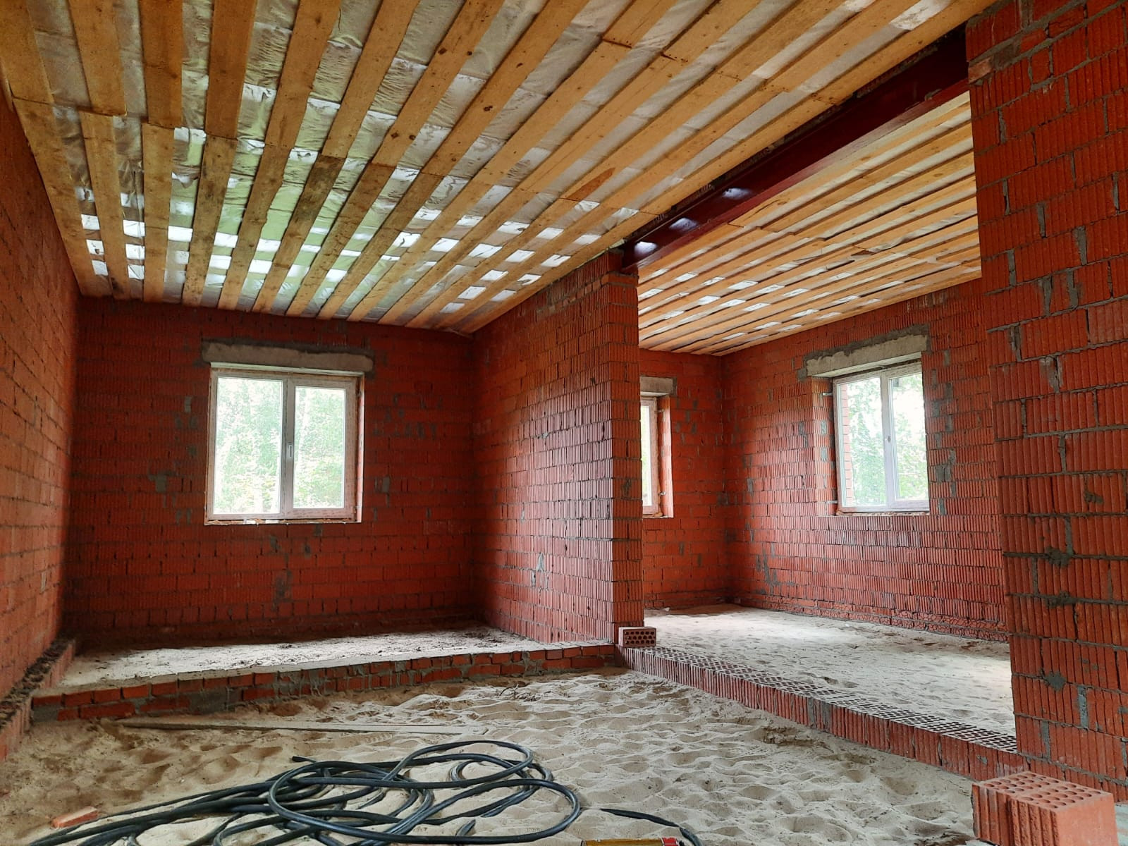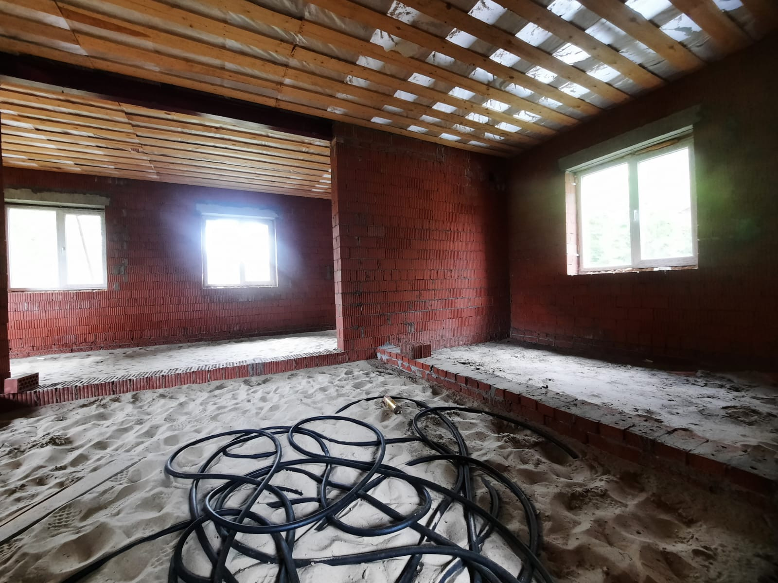 2 этажа (1-й и мансарда), кухня-гостиная (27,8 кв.м), 5 комнат