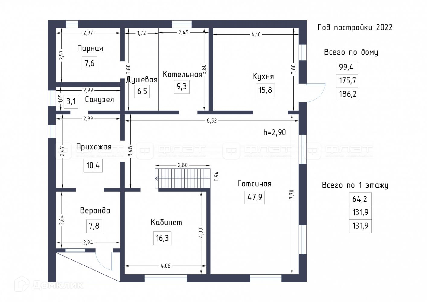 Итого по 1-этажу: 131,9 кв.м.