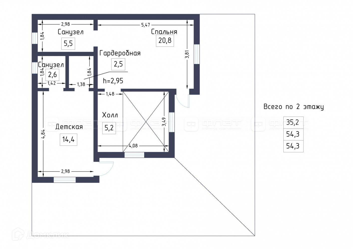 Итого по 2-этажу: 54,3 кв.м.
