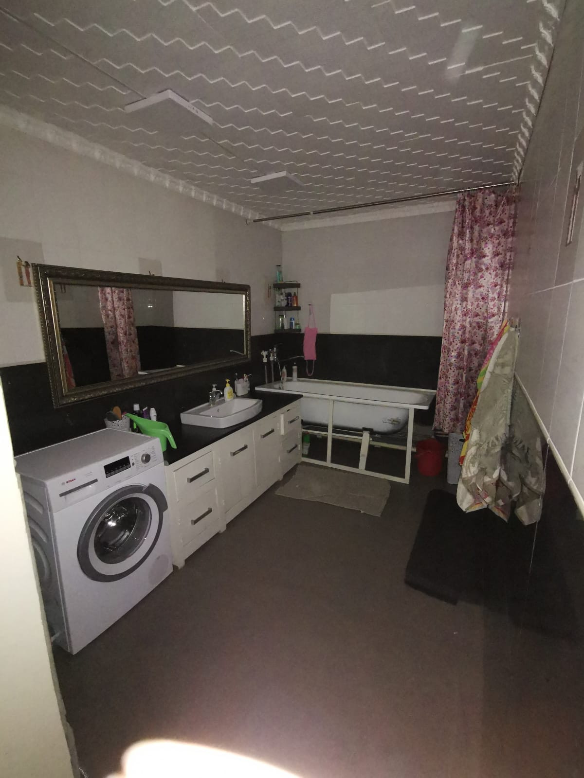 Имеется большая ванная комната 2,5*4,5 м., установлена дорогая стиральная машина автомат, итальянская большая ванна, фаянсовая раковина, зеркало во всю стену. Вытяжка.