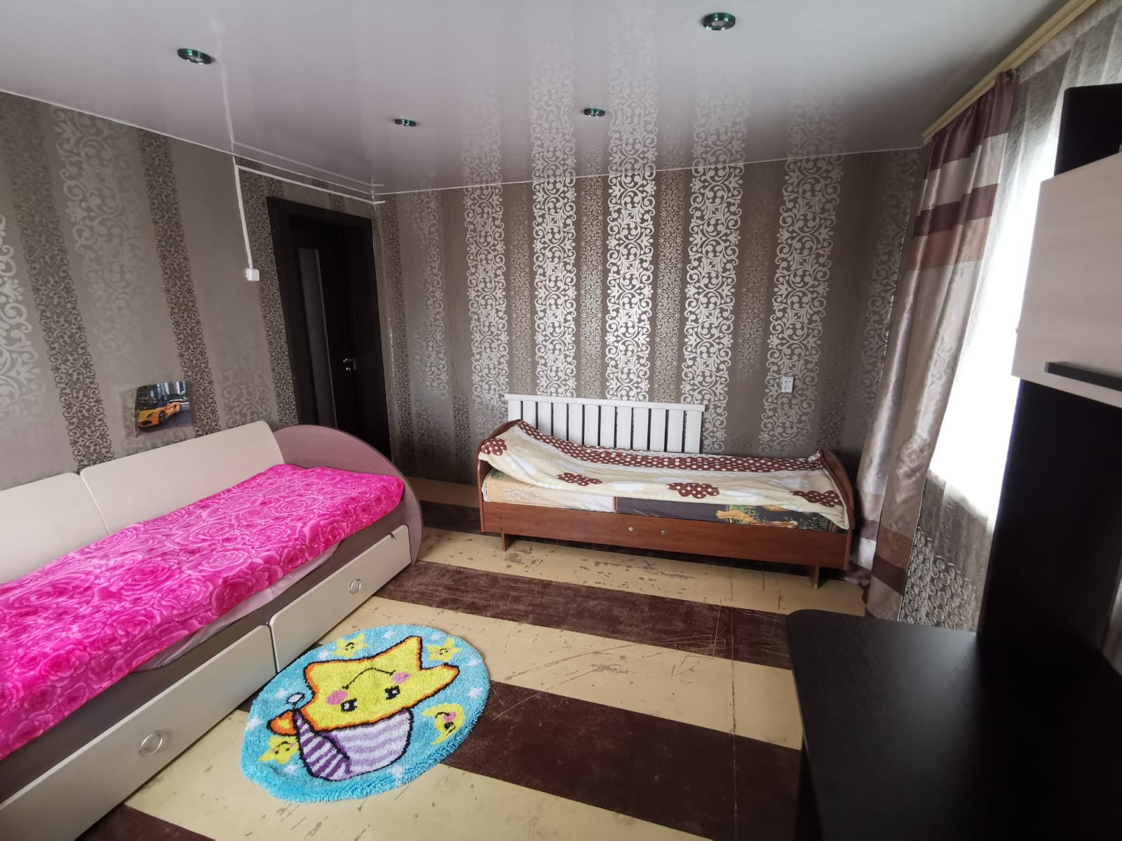 Пол двухслойный деревянный, доска 60 мм, ОСП 10 мм., лак 7 слоев. Стены штукатурка, обои. В ванной комнате и туалете на стенах плитка керамогранит, керамика. Потолки частично натяжные, частично клееный полистирол. Проводка медь, в защищенных кабель-каналах. На все контура имеются устройства защиты, автоматы.