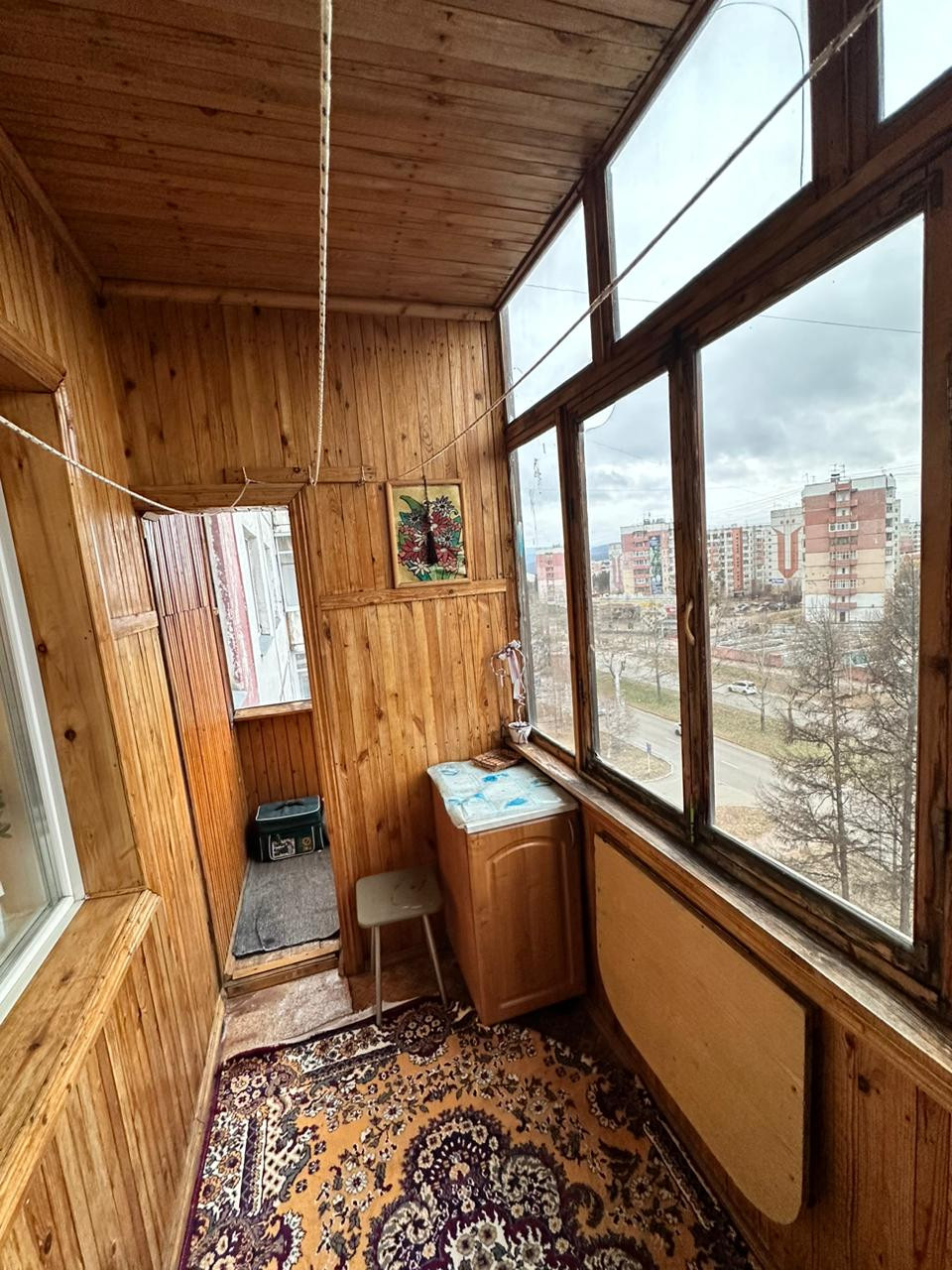 Балкон обшит деревом, застеклен обычной рамой