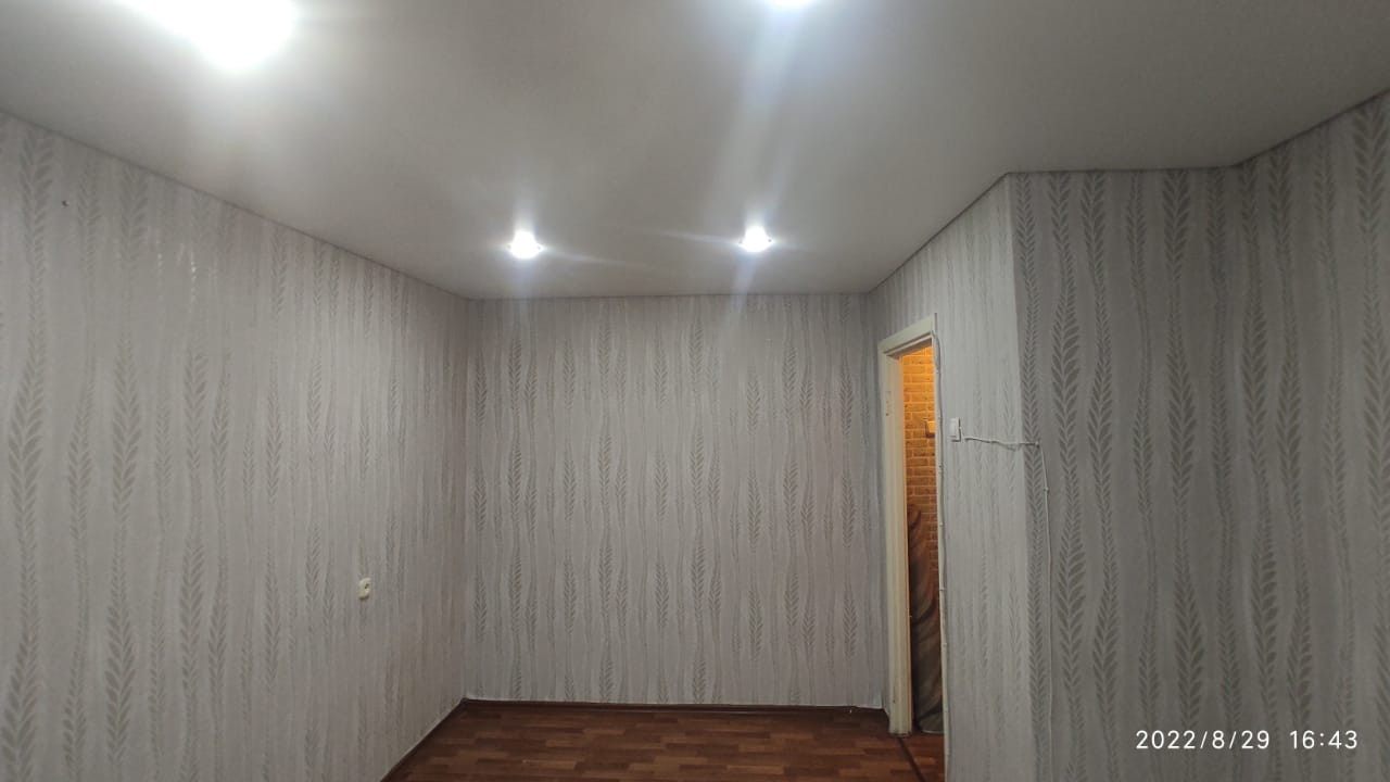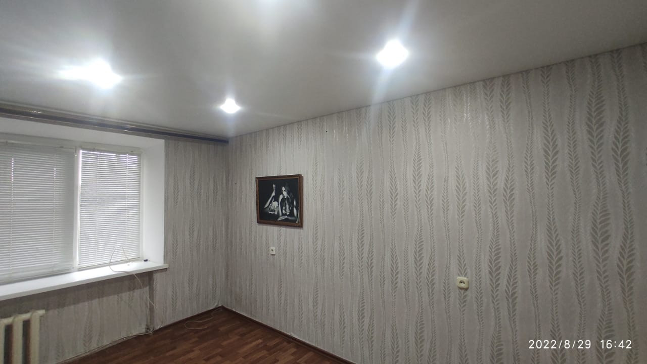 В комнате натяжной потолок, окна ПВХ.