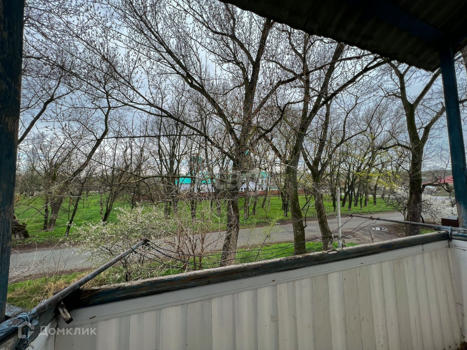 Балкон не застеклён, вид на небольшой парк и церковь.