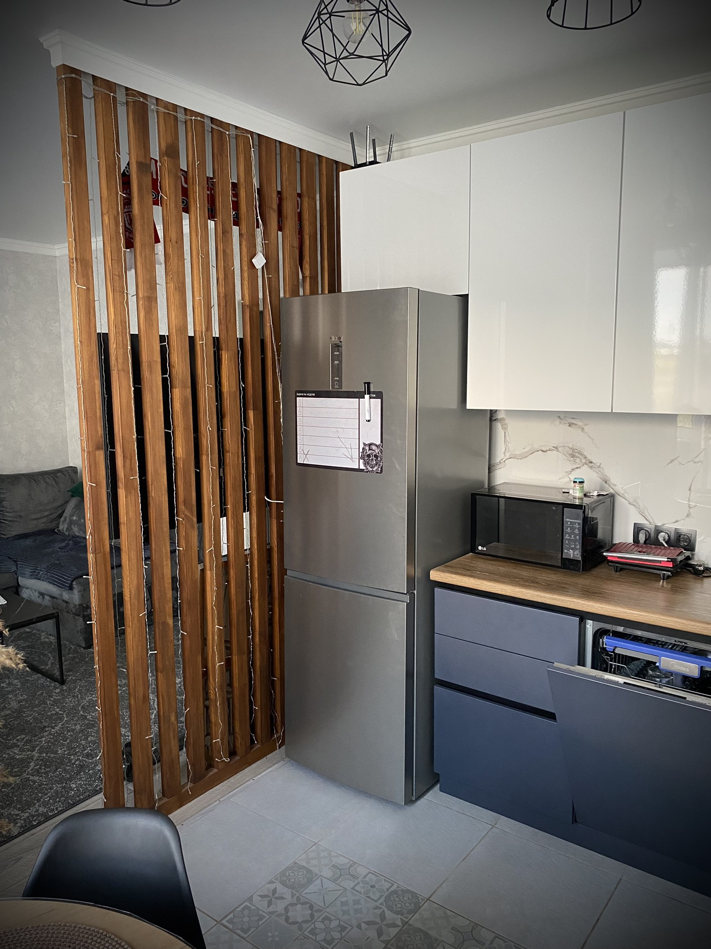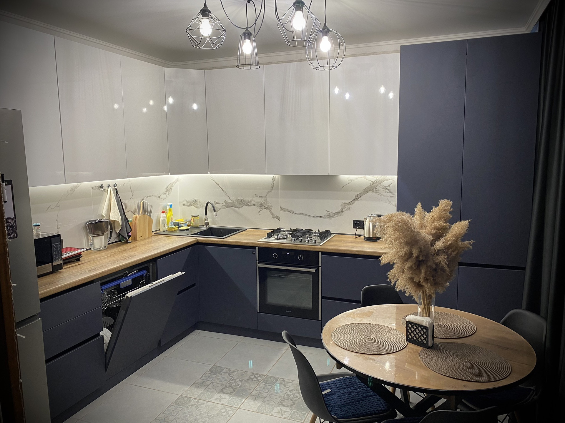 -Большая кухня с большим количеством шкафов и ящиков , раскладной стол , посудомоечная  машина ,газовая плита , электрический духовой шкаф , вытяжка , сенсорная подсветка кухни , холодильник