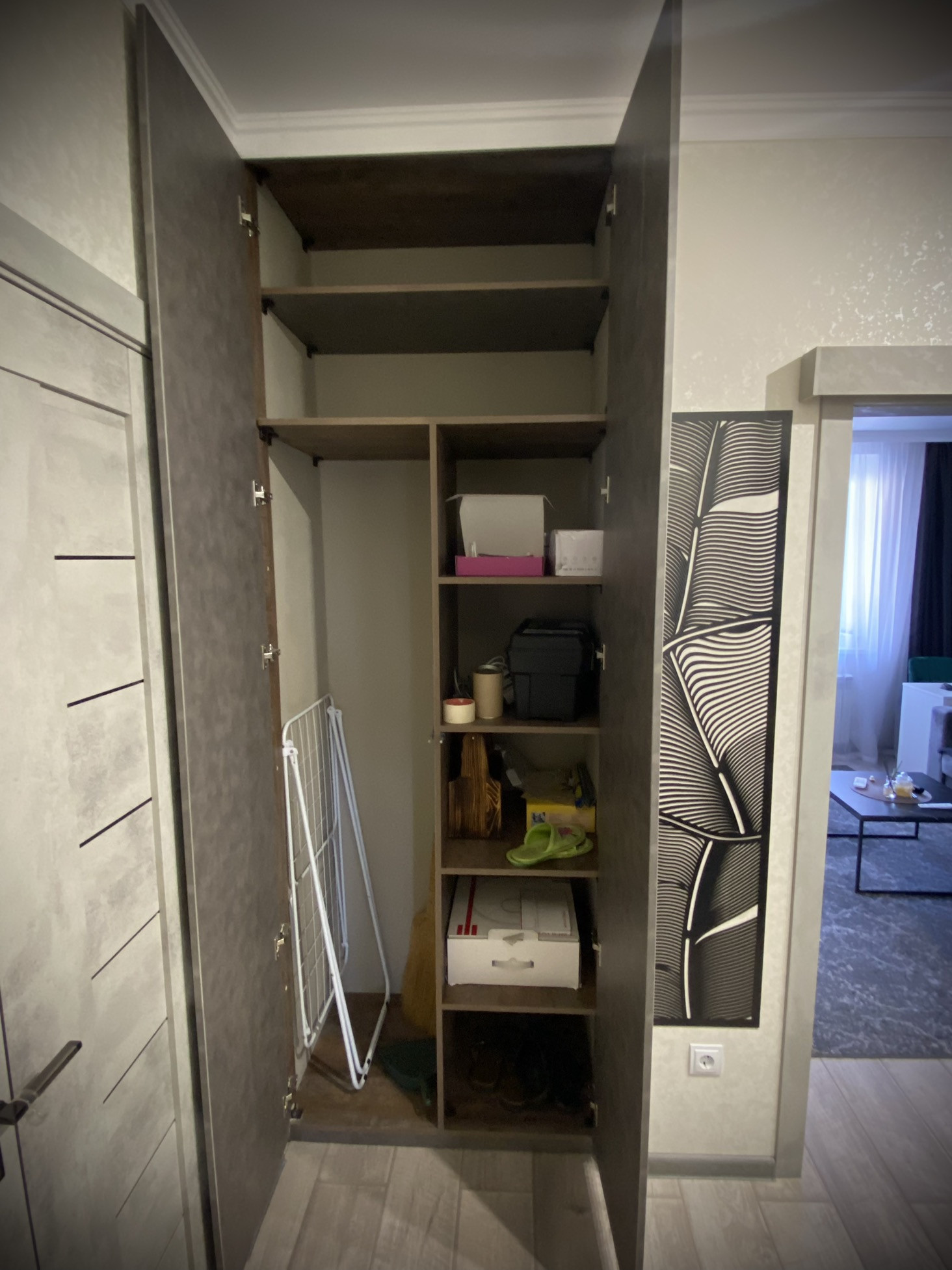 -В коридоре вместительная кладовая , а также удобный шкаф с хранением вещей , обувницей , пуфиком и вешалкой