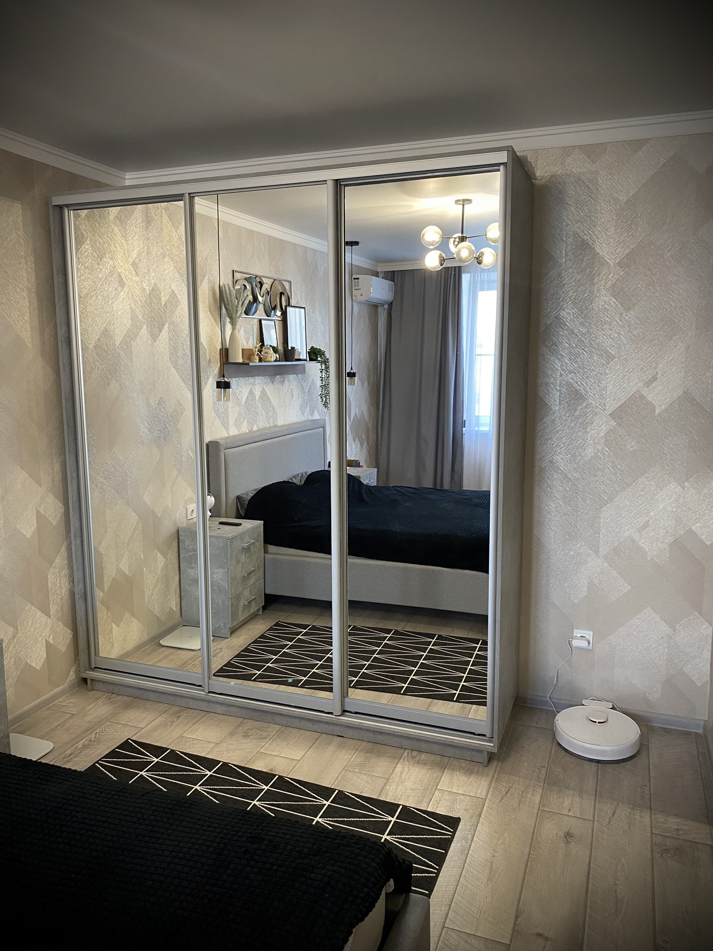 -В спальне шкаф купе с зеркалами , кровать 160*200 с подъемные механизмом  , тумбы у кроватей со свои освещением.
