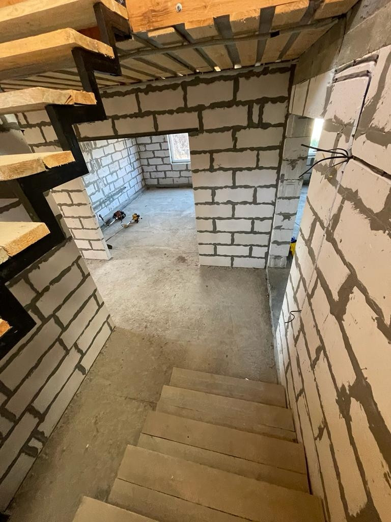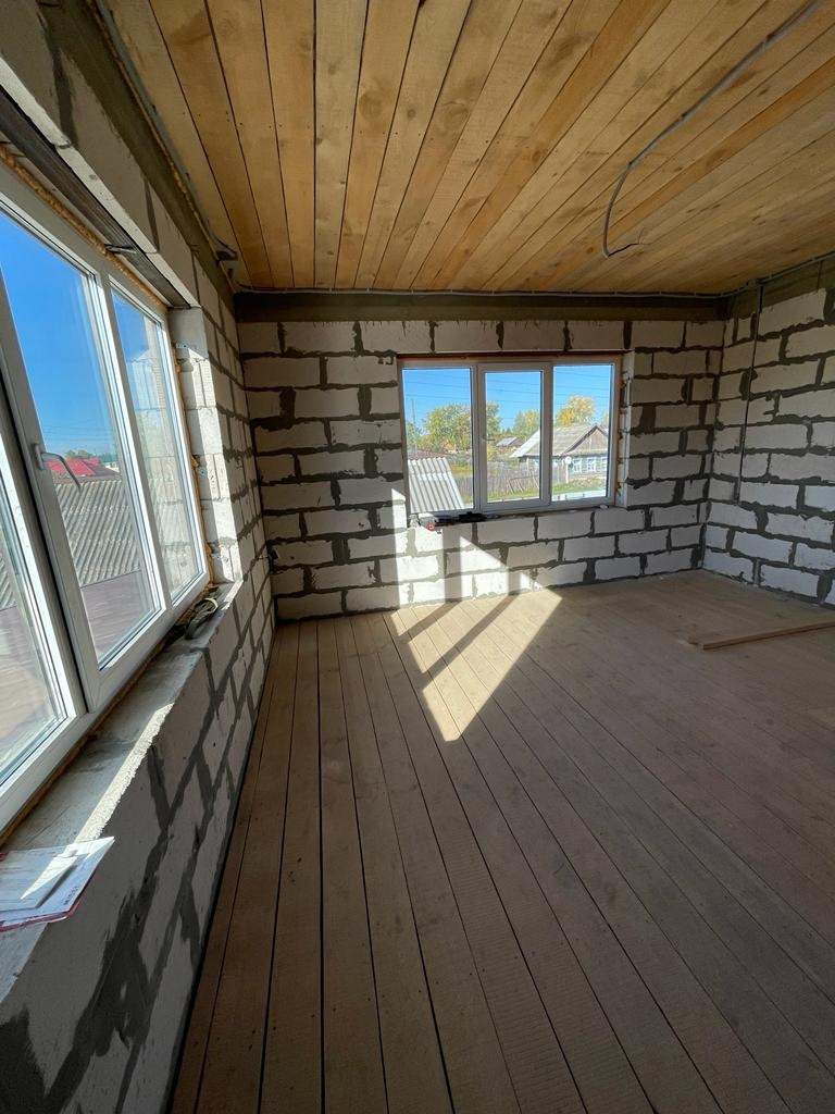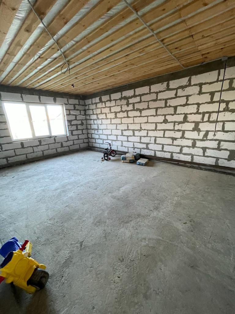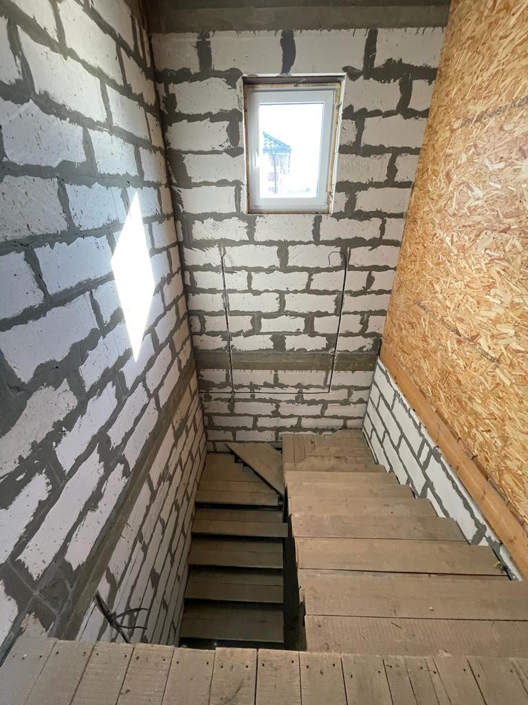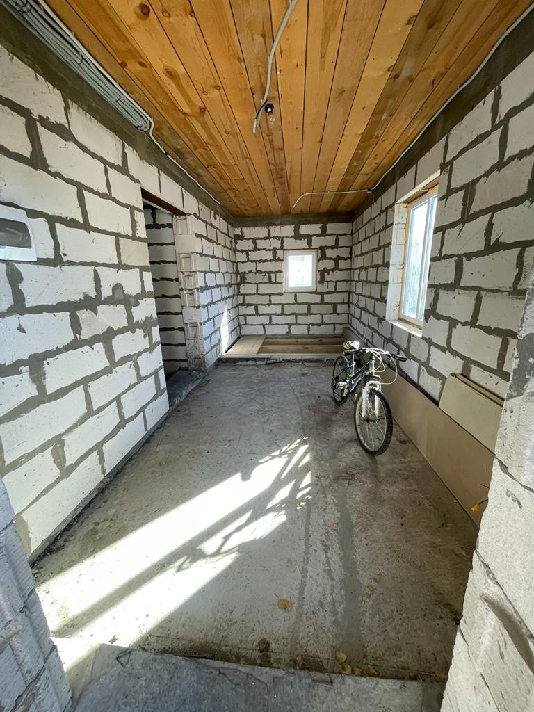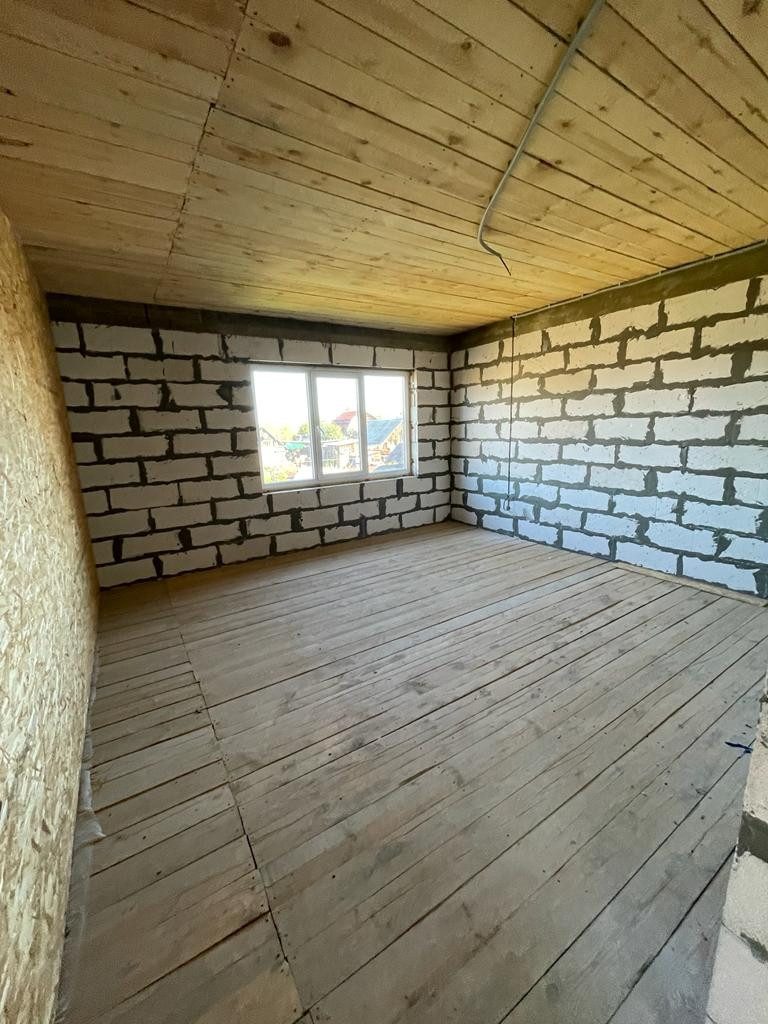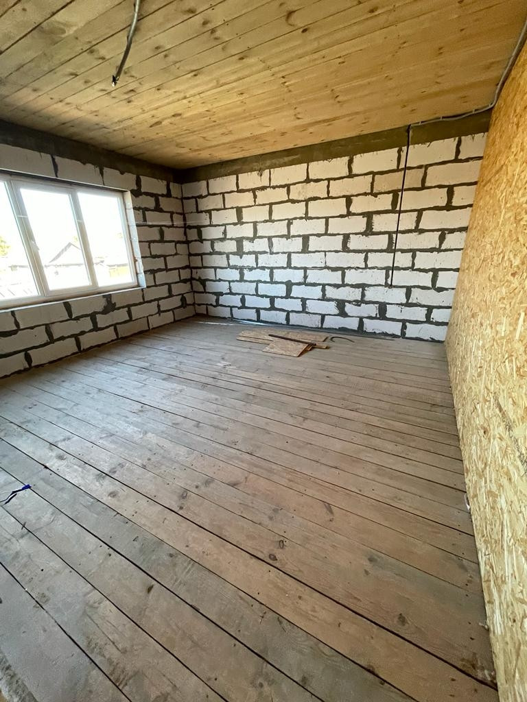 2) Новый просторный дом из газоблока. Дом строился для себя из качественных строительных материалов. На первом этаже расположены котельная, кухня 25 кв.м., просторная гостиная, комната для гостей, санузел. На втором этаже три большие комнаты и санузел. Имеется проект на газ, в доме электричество, сделан выход для автономной канализации и подведения водоснабжения. В доме установлены ламинированные пластиковые окна, крыша и межэтажное перекрытие утеплены, выполнены все черновые работы, все подготовлено под чистовую отделку. В доме установлена капитальная лестница на второй этаж.