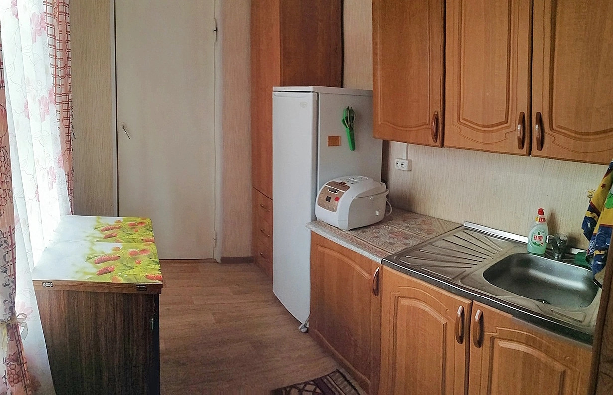 В квартире сделан качественный ремонт (выровнены стены, на полу – ламинат, межкомнатные двери из шпона, потолок – панели, деревянные стеклопакеты).