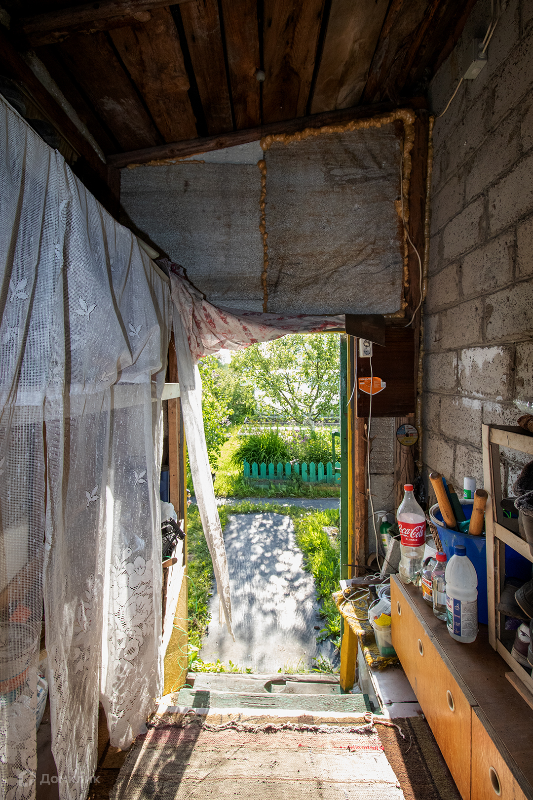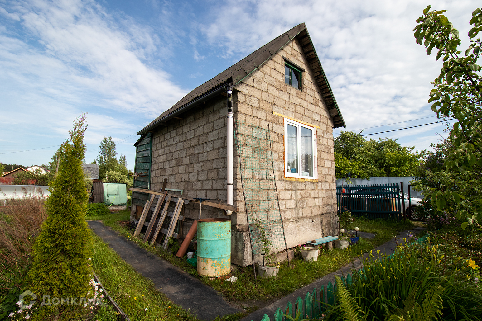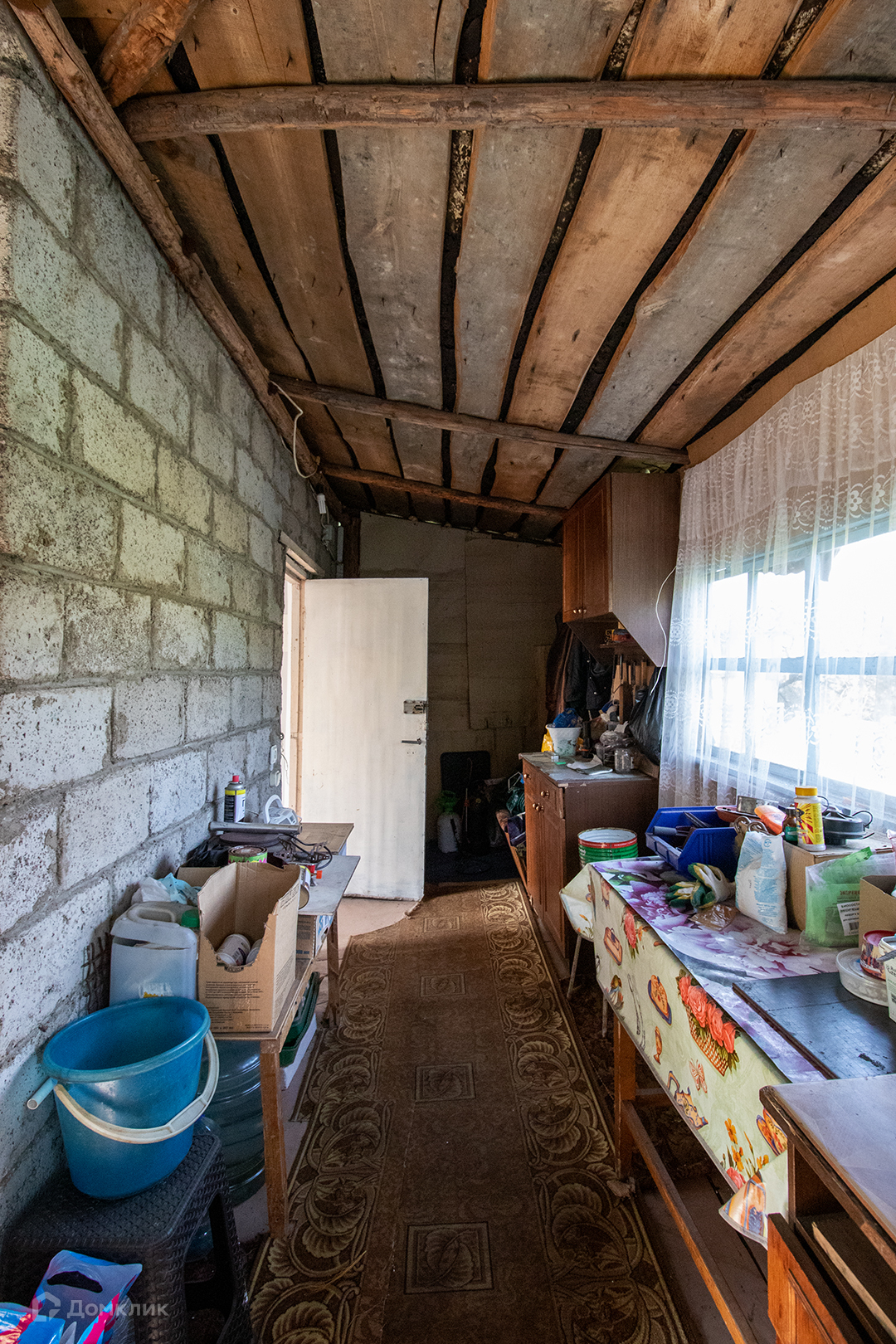 25 м.кв. два этажа, построен из керамзитобетона на блочном фундаменте. На 1 этаже  одна комната и пристроенная терраса на которой расположена кухня. Под домом есть кессон: 1.5х1.5  прекрасное место для хранения заготовок.