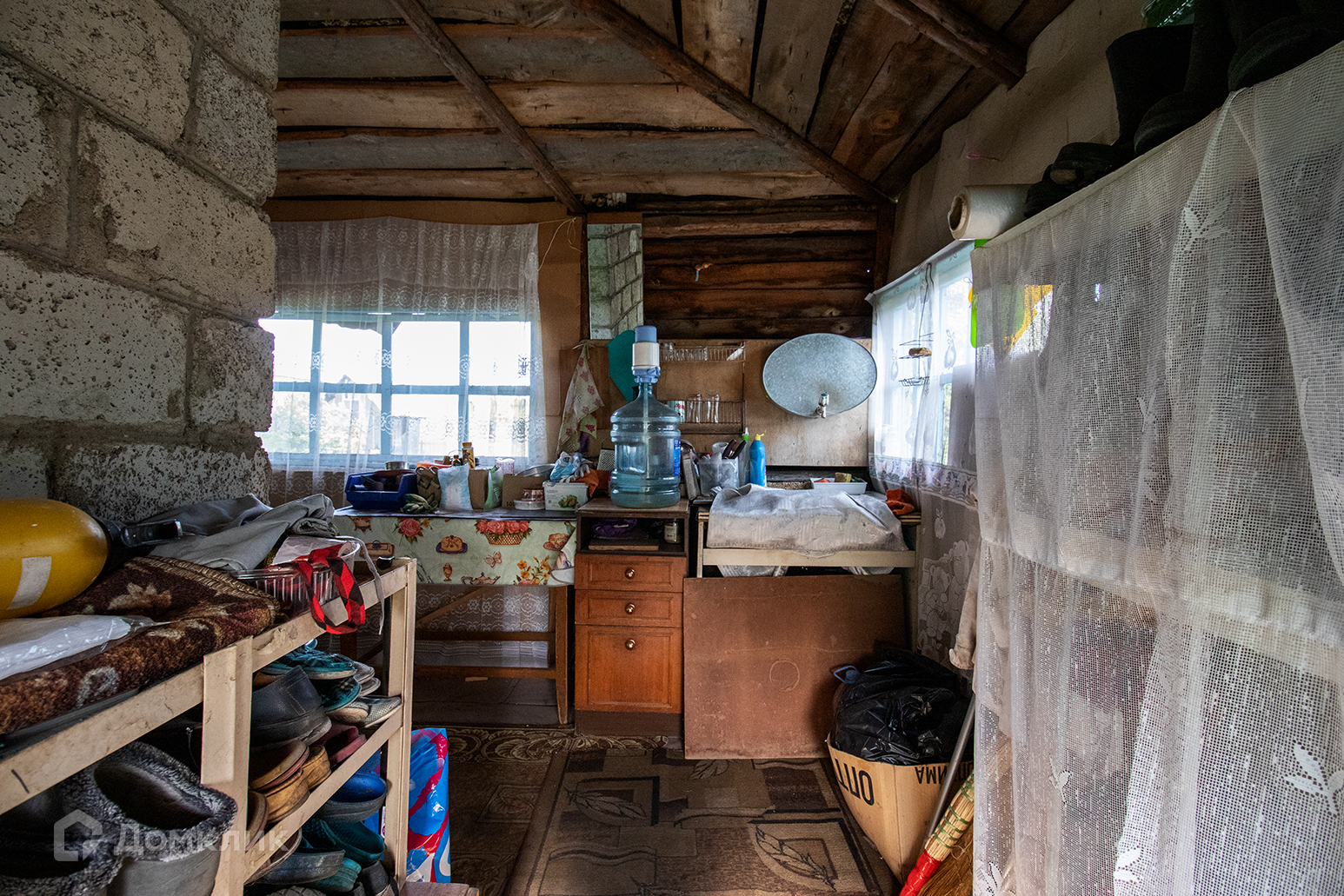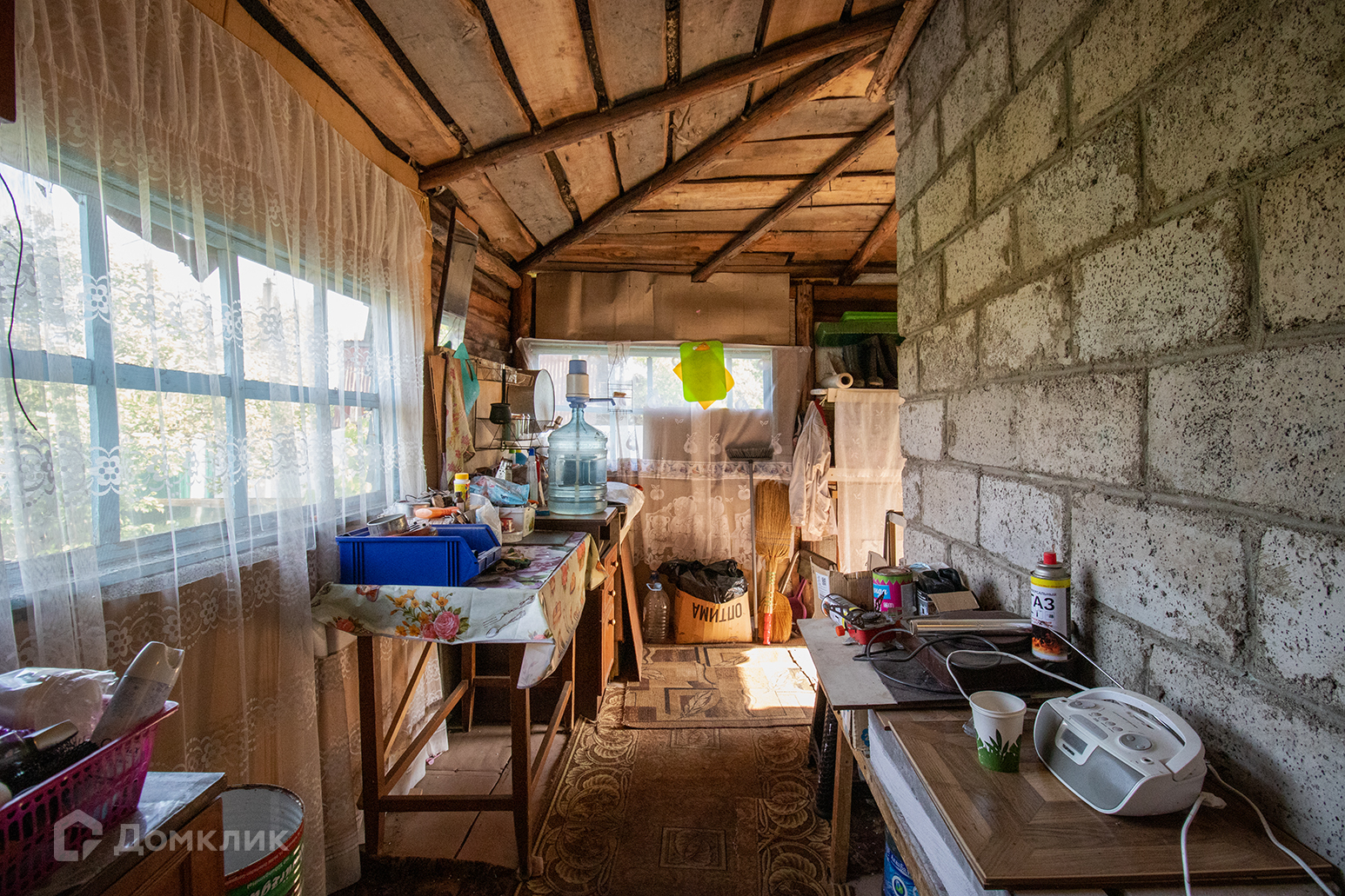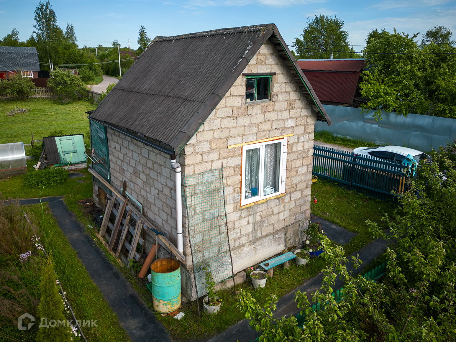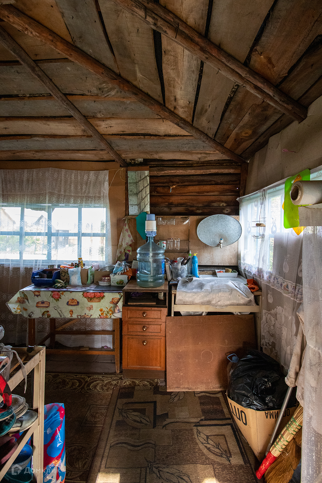 25 м.кв. два этажа, построен из керамзитобетона на блочном фундаменте. На 1 этаже  одна комната и пристроенная терраса на которой расположена кухня. Под домом есть кессон: 1.5х1.5  прекрасное место для хранения заготовок.