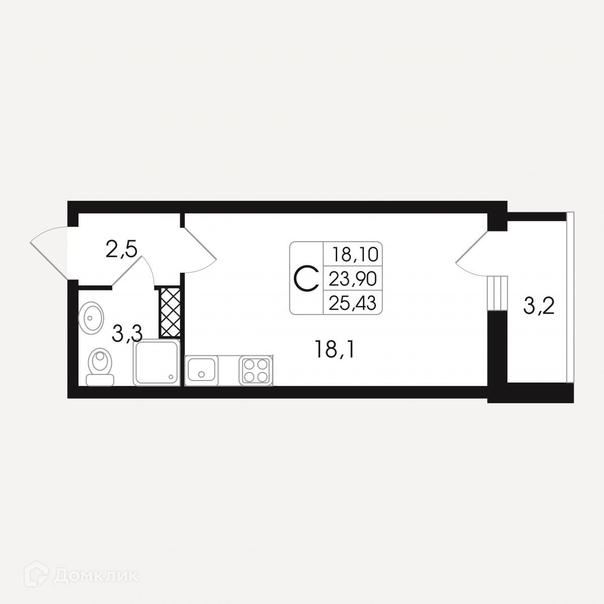 Общая площадь 25.43 м2