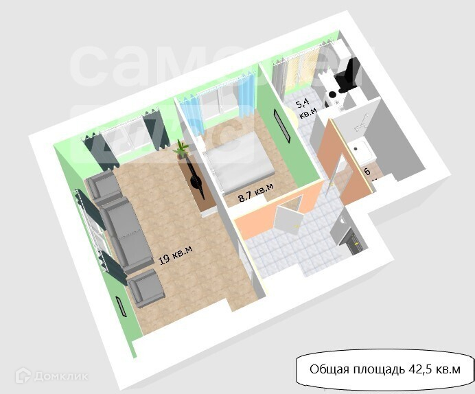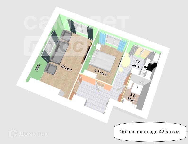 - Общая площадь: 42,5 кв.м.