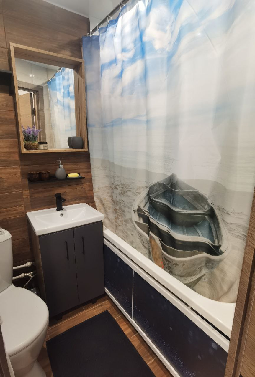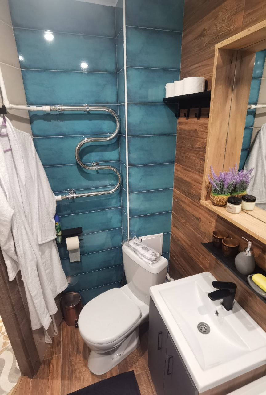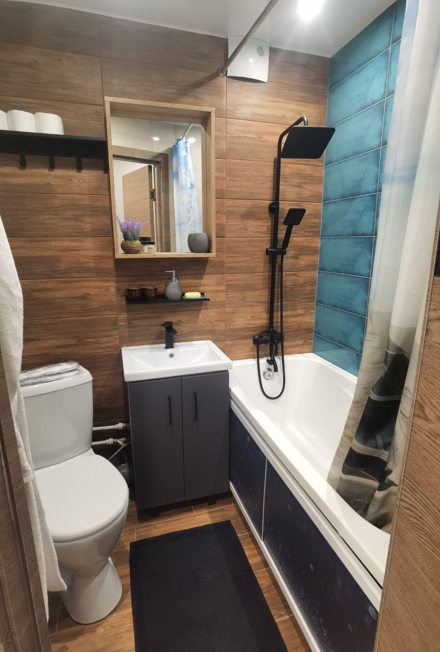 Совмещенный санузел выложен кафельной плиткой. Новые ванна и унитаз.