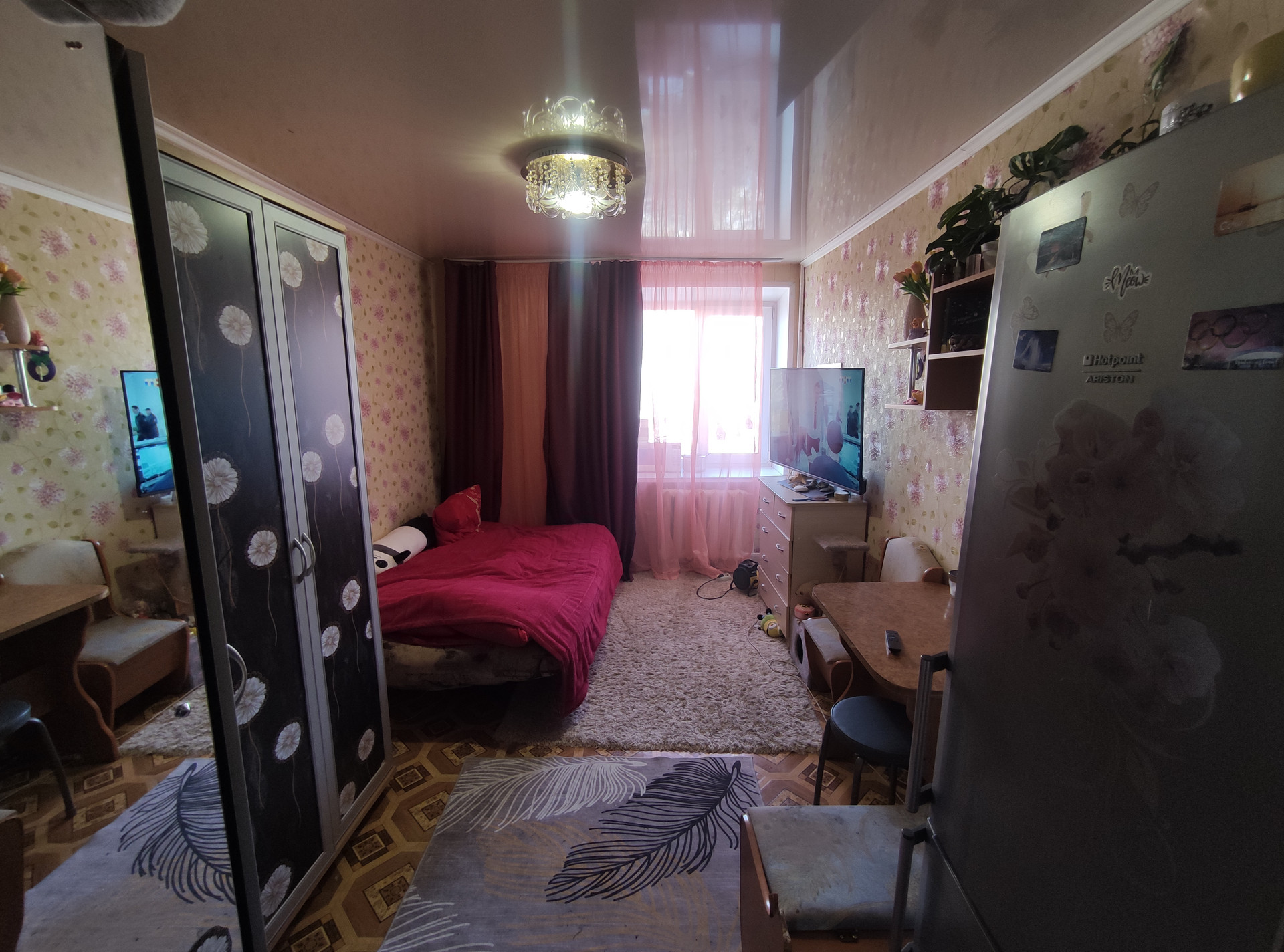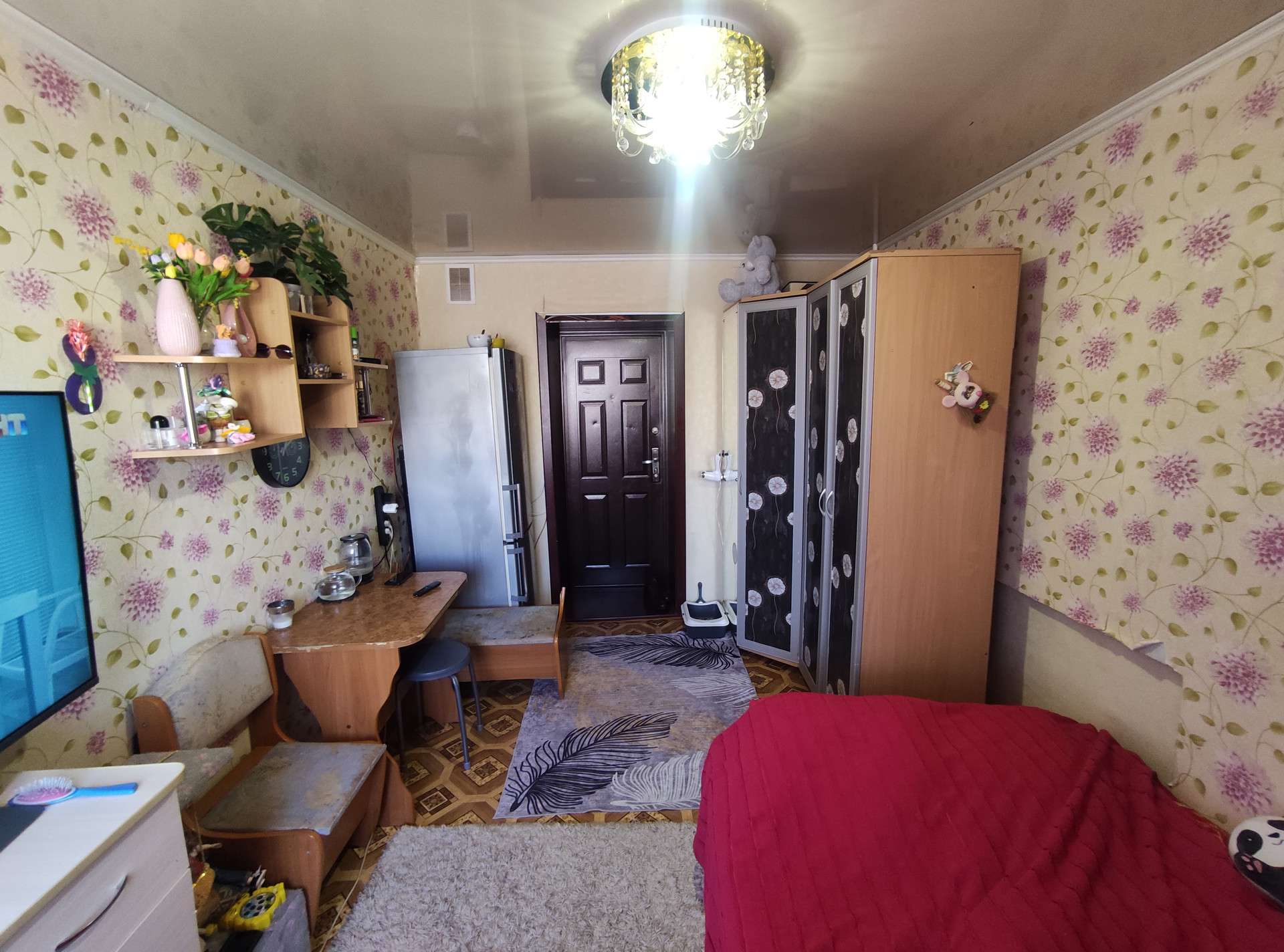 В комнате входная дверь, пластиковое окно, натяжной потолок, косметический ремонт.