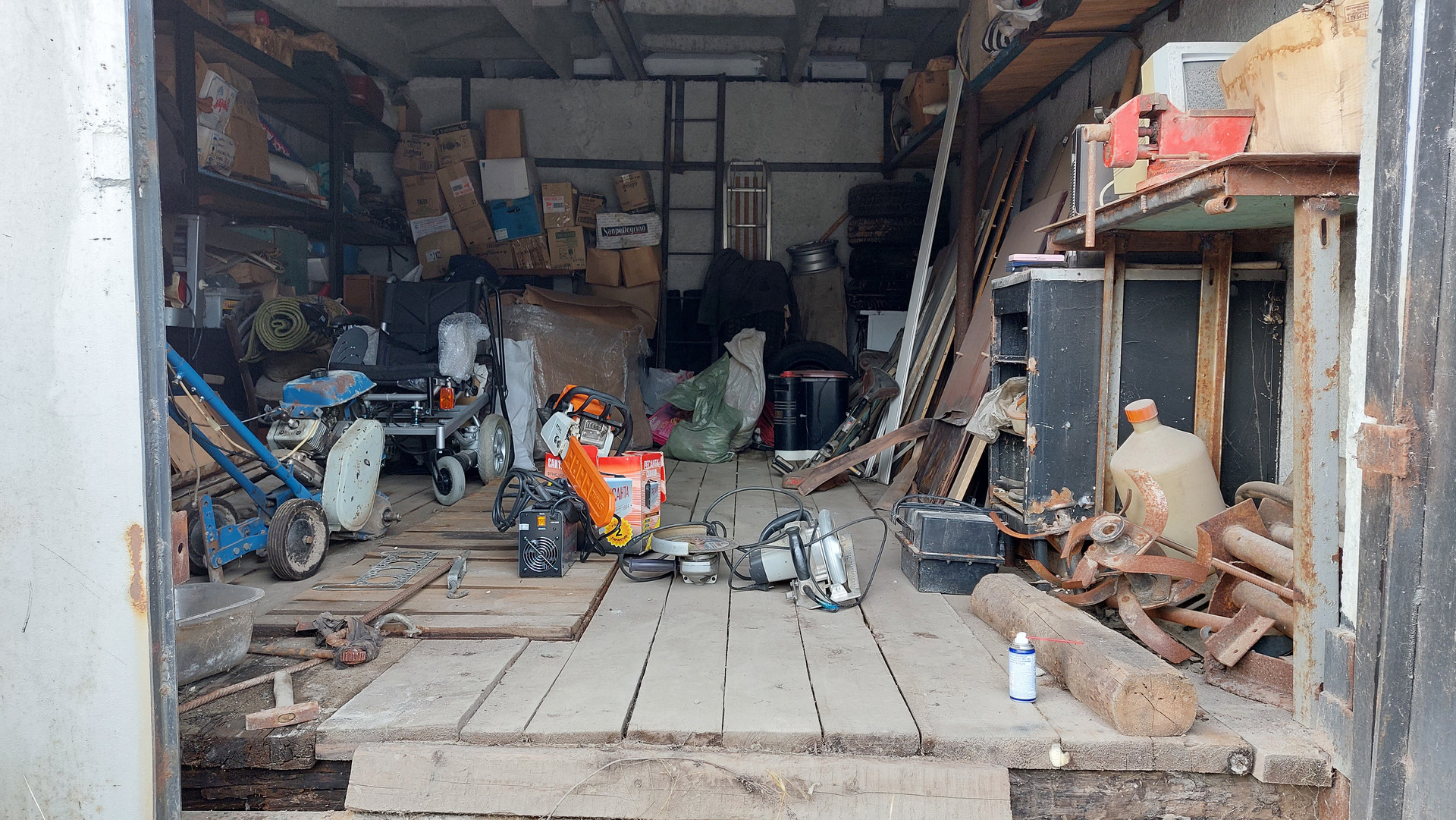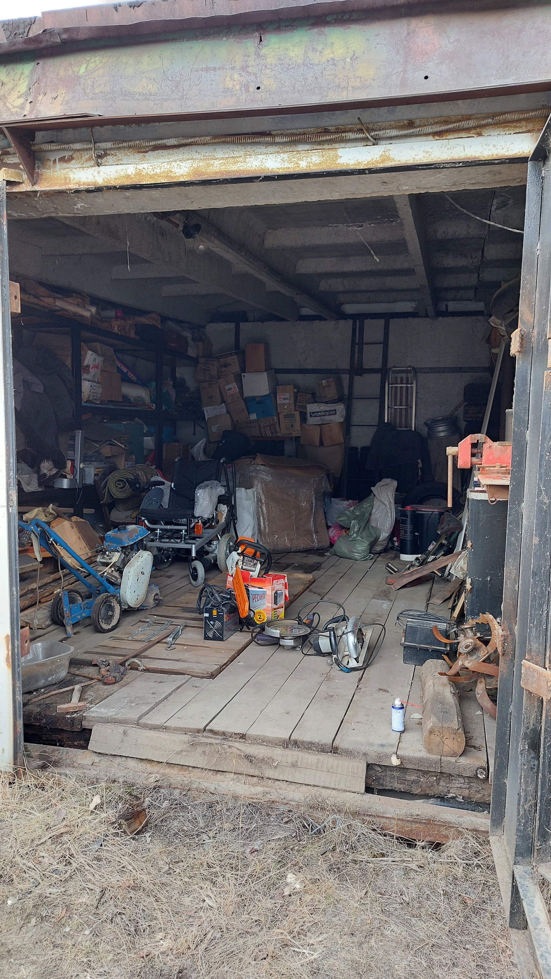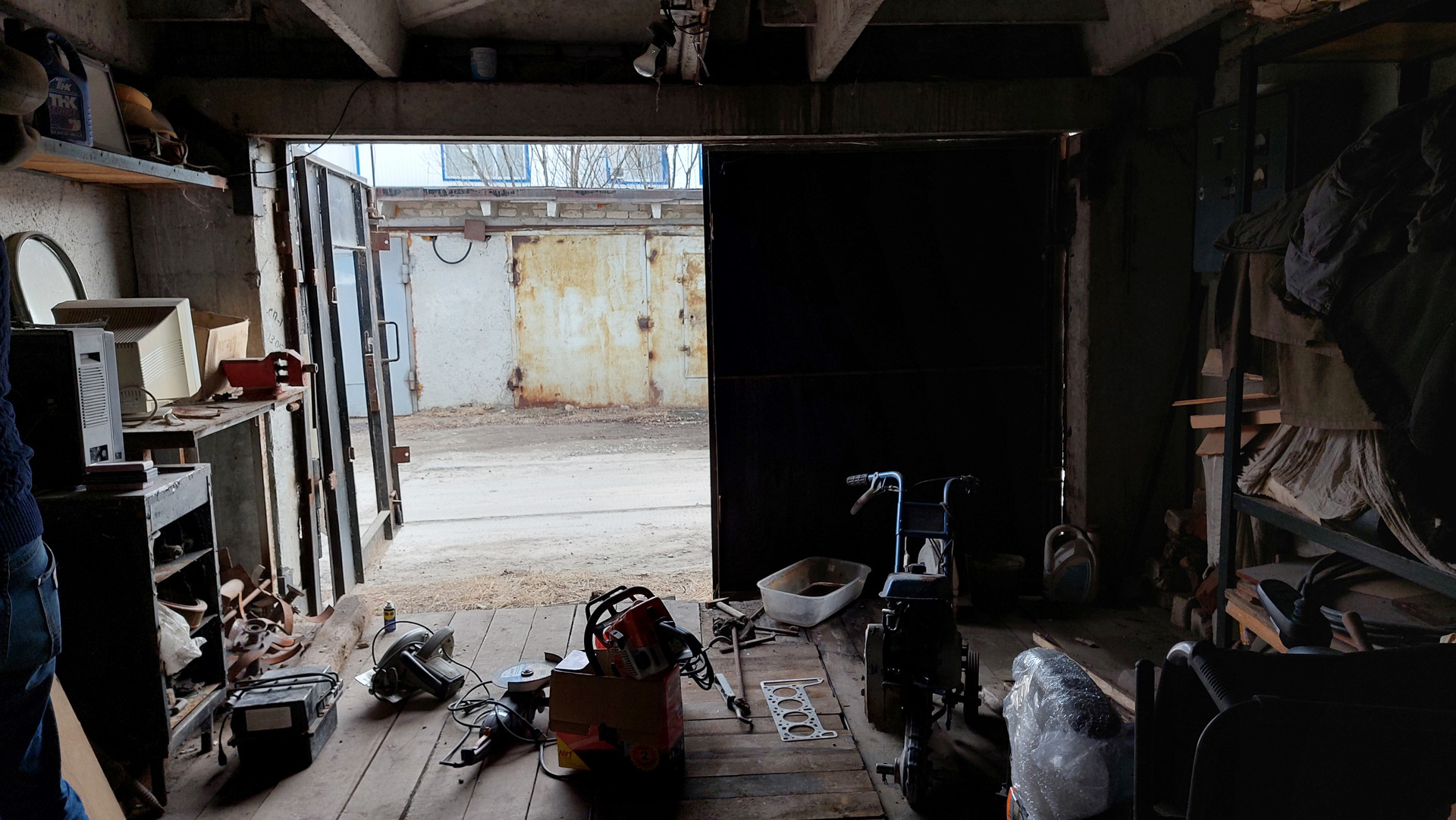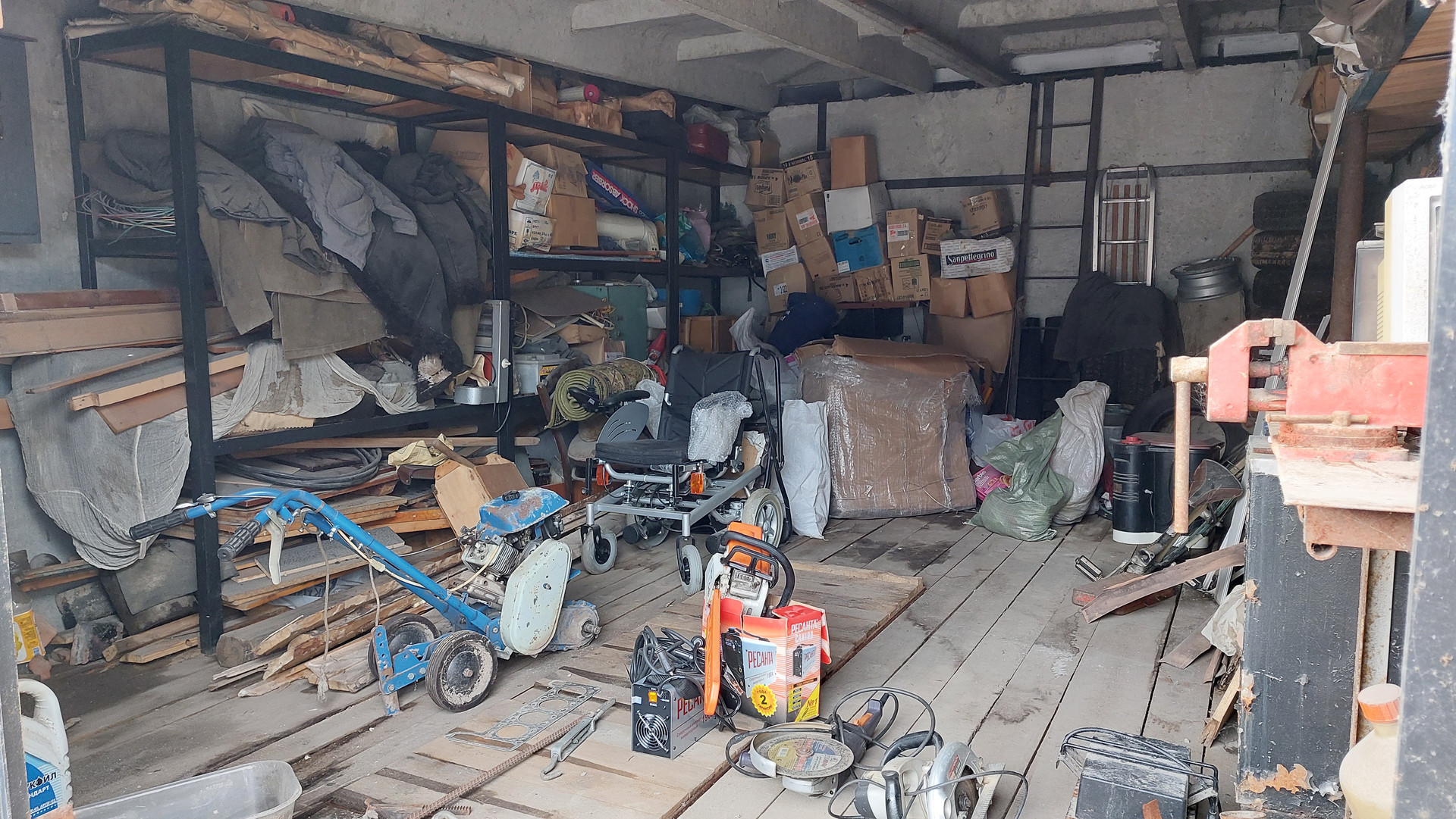 Имеется смотровая яма, стеллажи, слесарный стол, тиски слесарные.