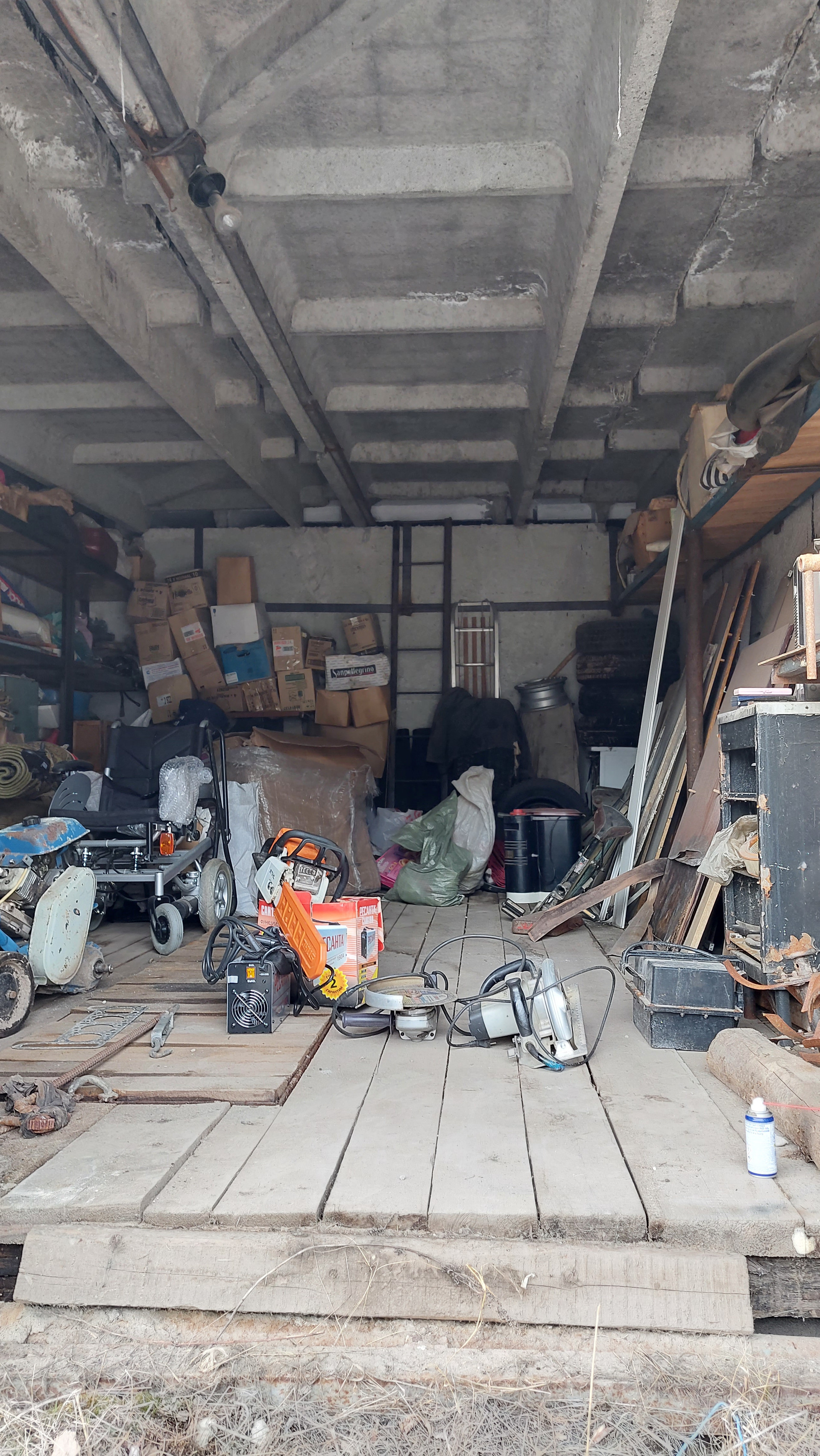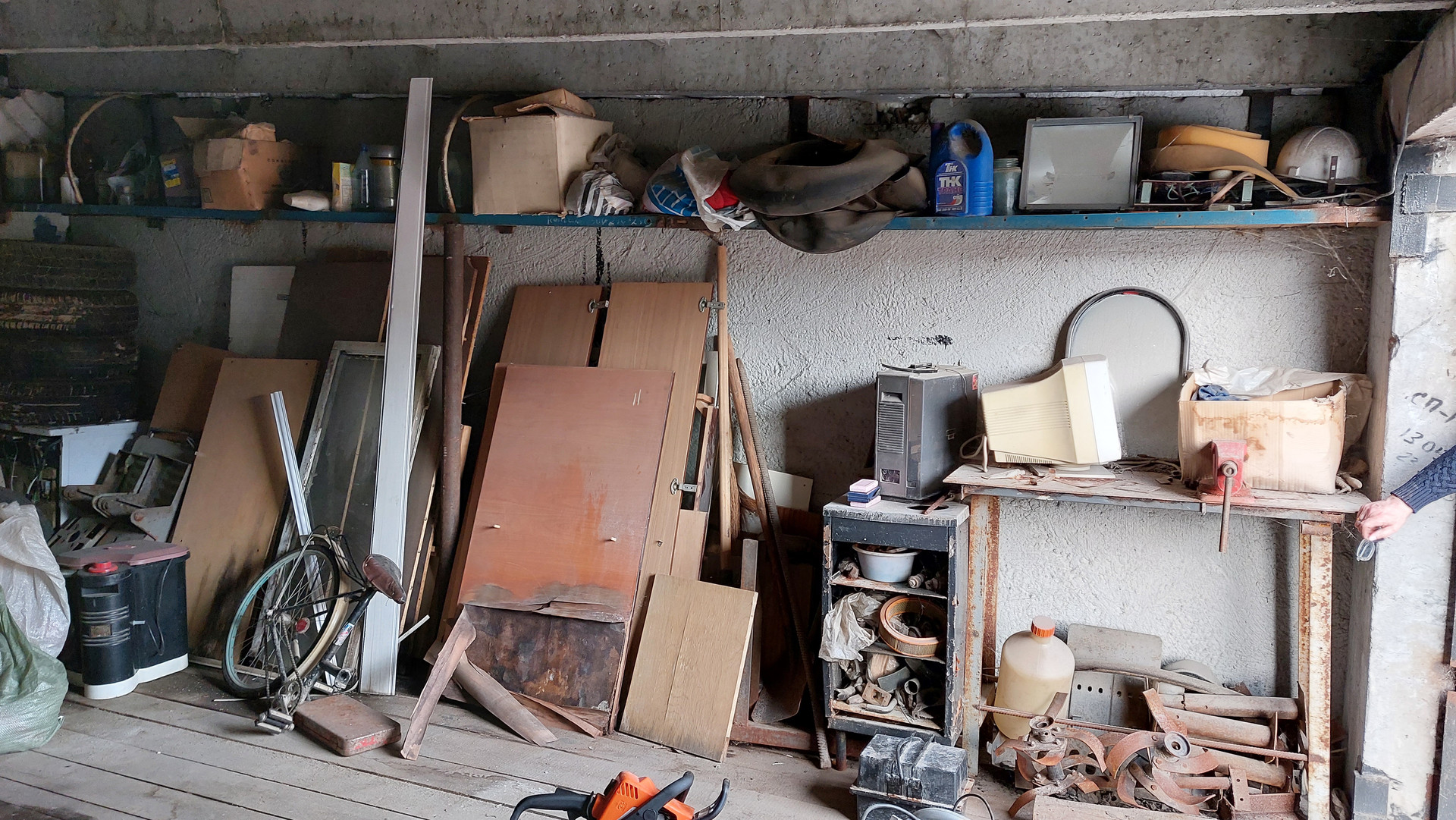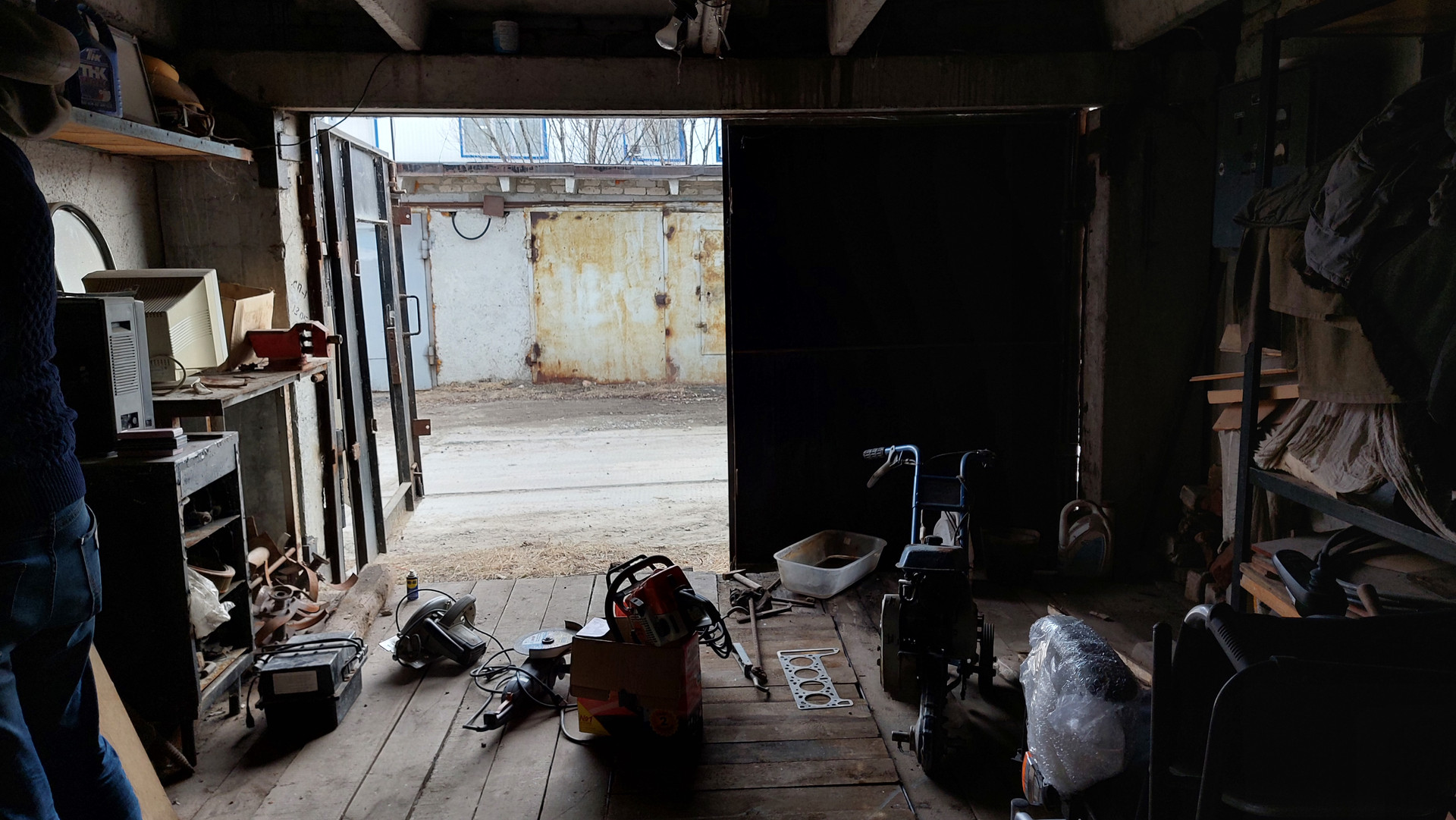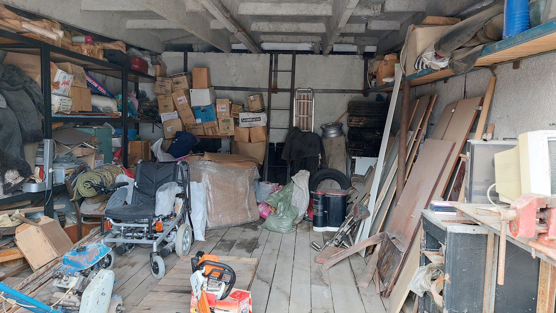 Имеется смотровая яма, стеллажи, слесарный стол, тиски слесарные.