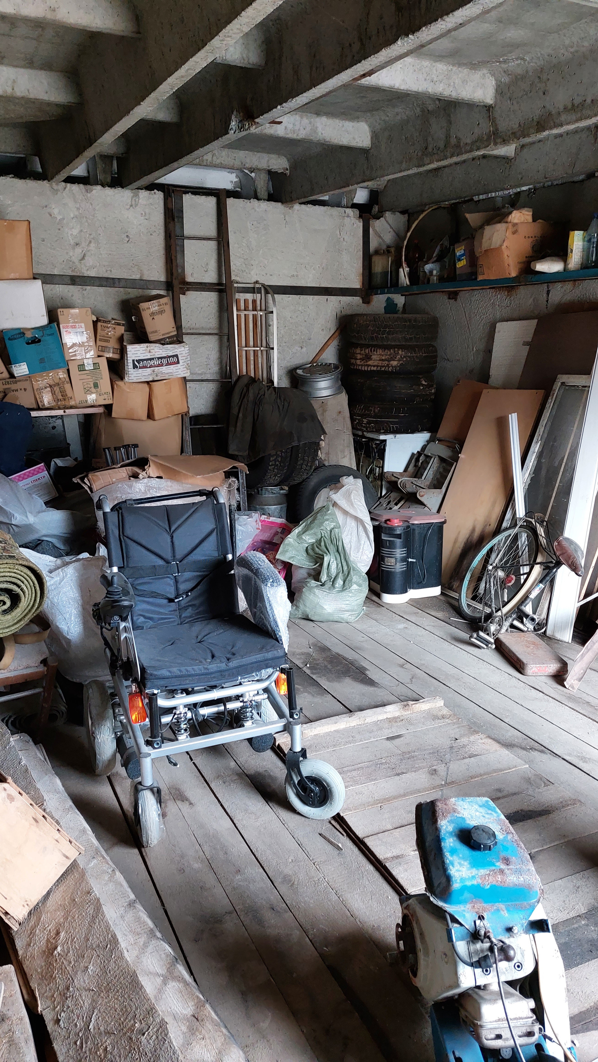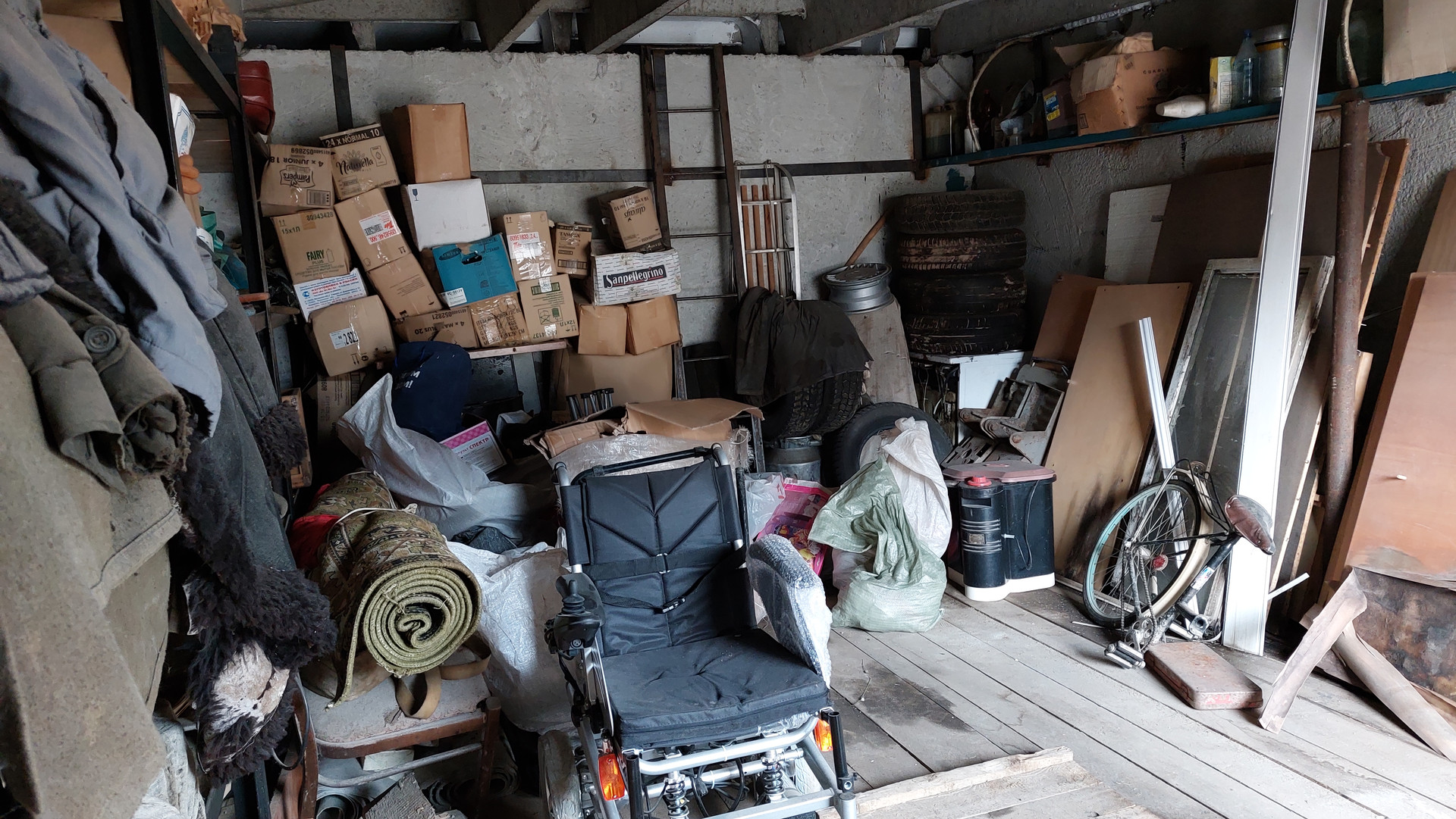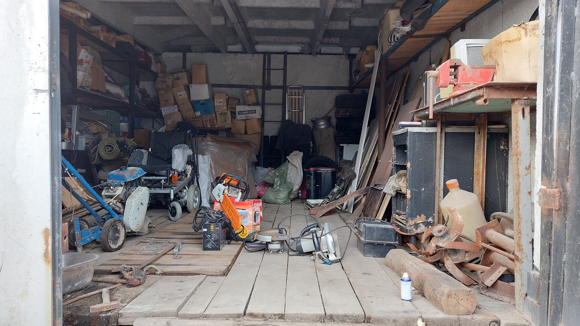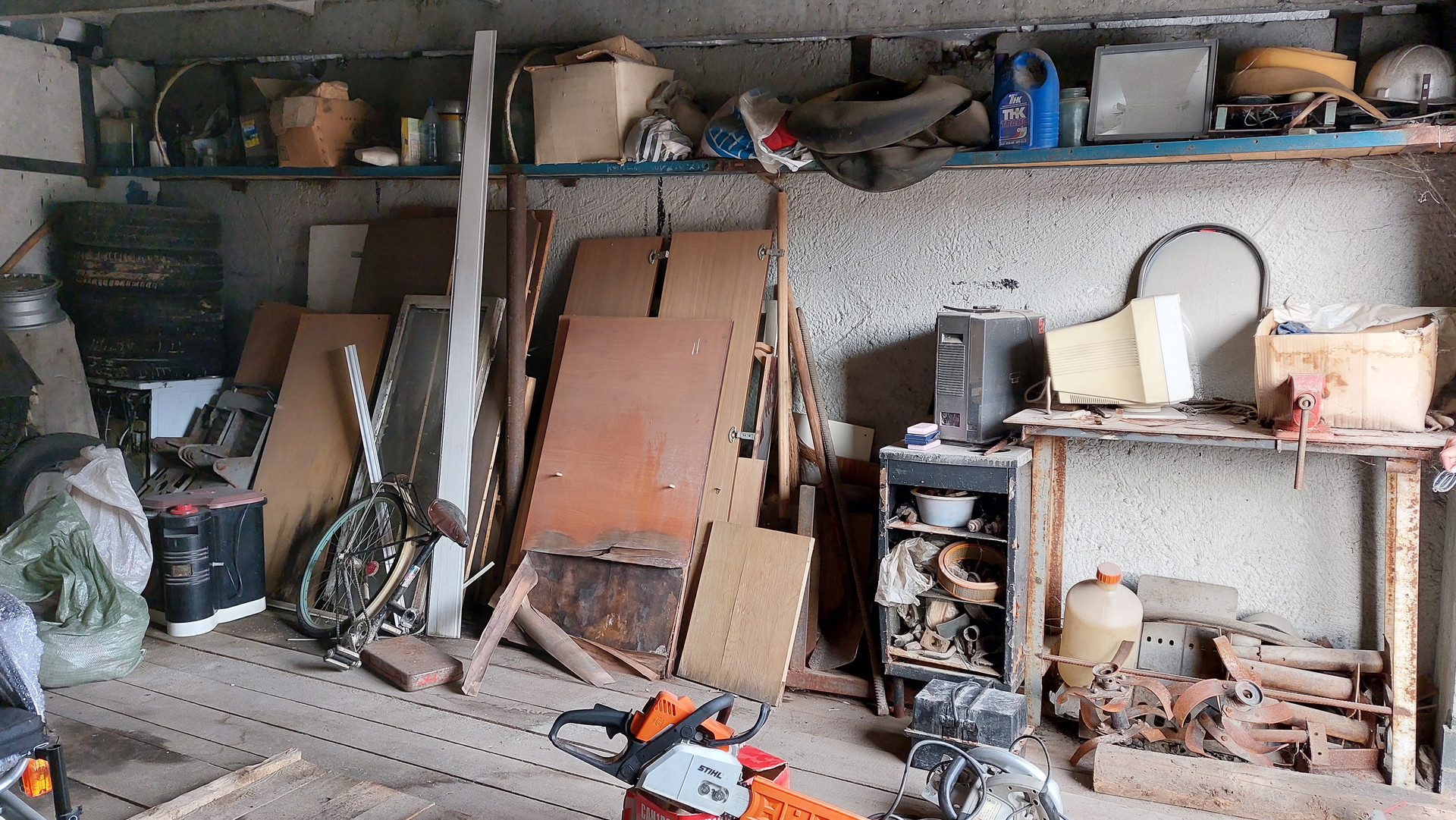 Имеется смотровая яма, стеллажи, слесарный стол, тиски слесарные.