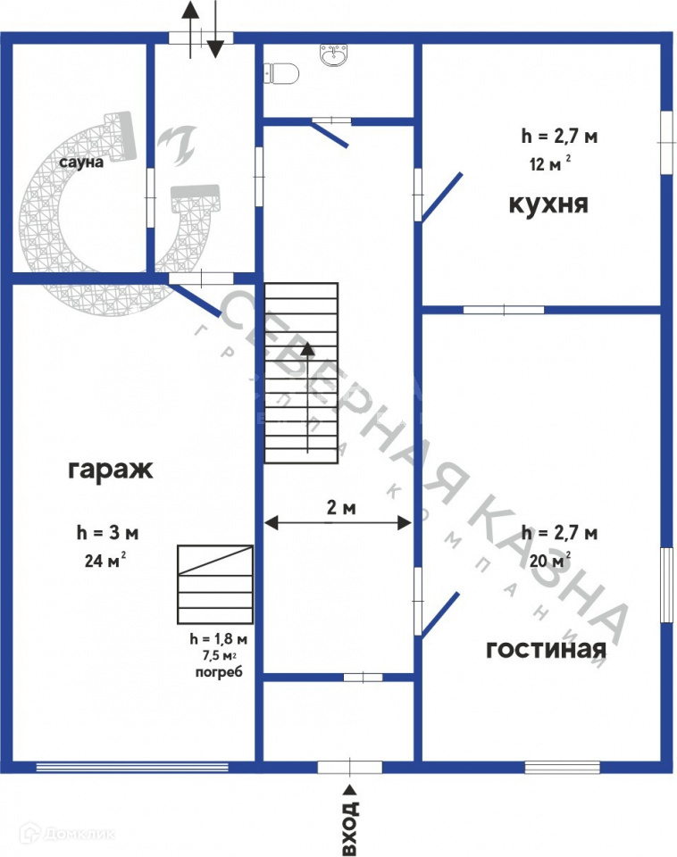 Цокольный этаж: высота 2м, свободная планировка.