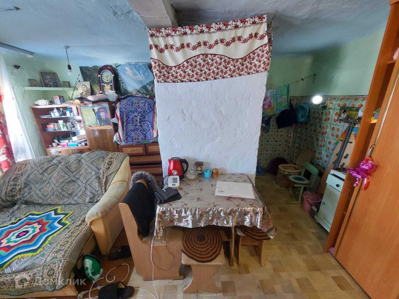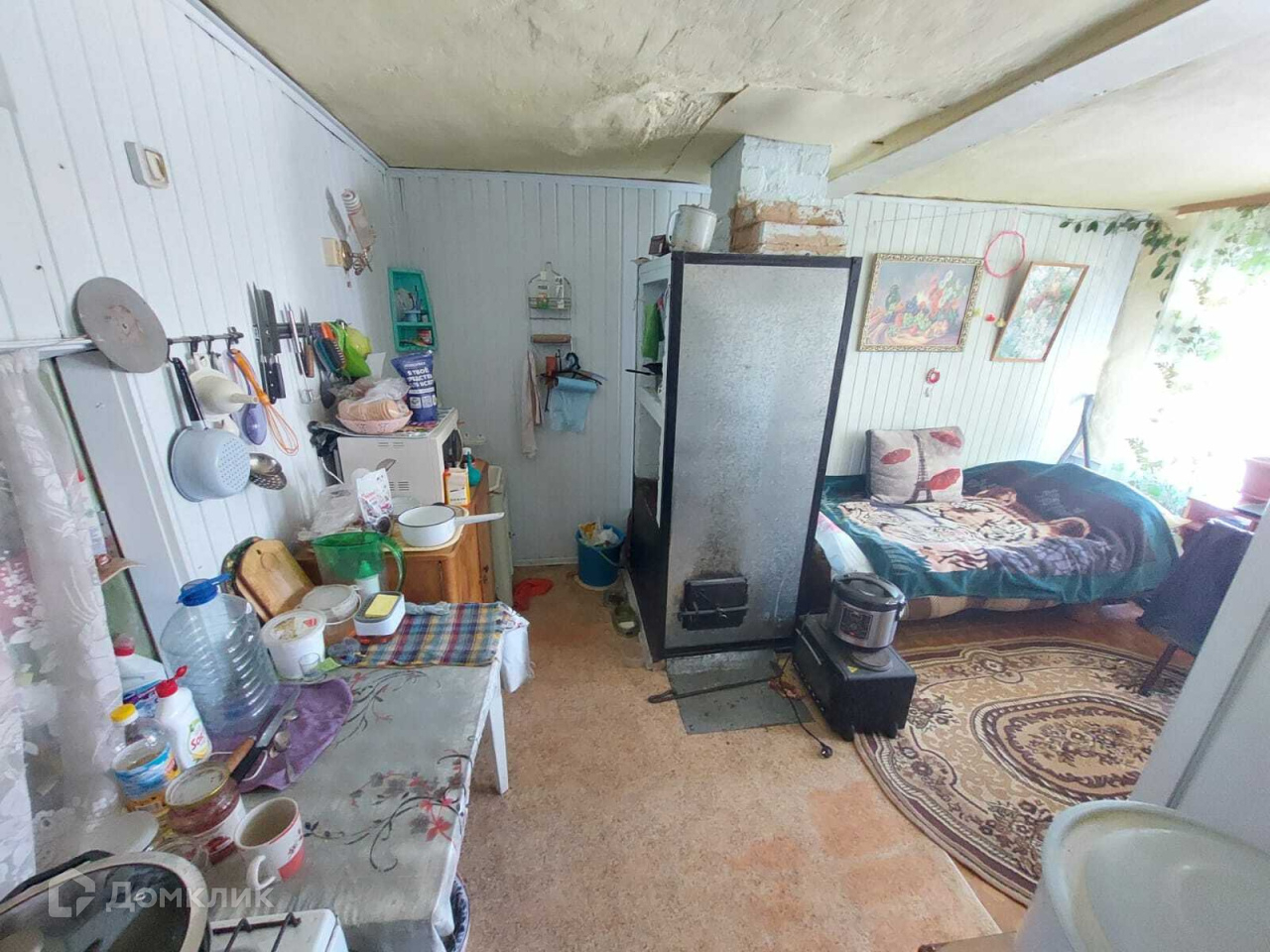 Общая площадь дома составляет 34,7 м². В доме две комнаты: спальня и просторная кухня-гостиная. Дом из бревна. Состояние отличное, жилое. Дом тёплый и светлый. Отопление печное, имеется две шведки. Воды в доме нет, есть летний водопровод и есть возможность подвести центральную воду. К дому подведён газ.