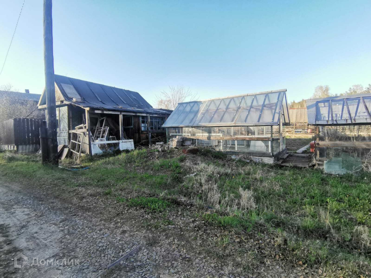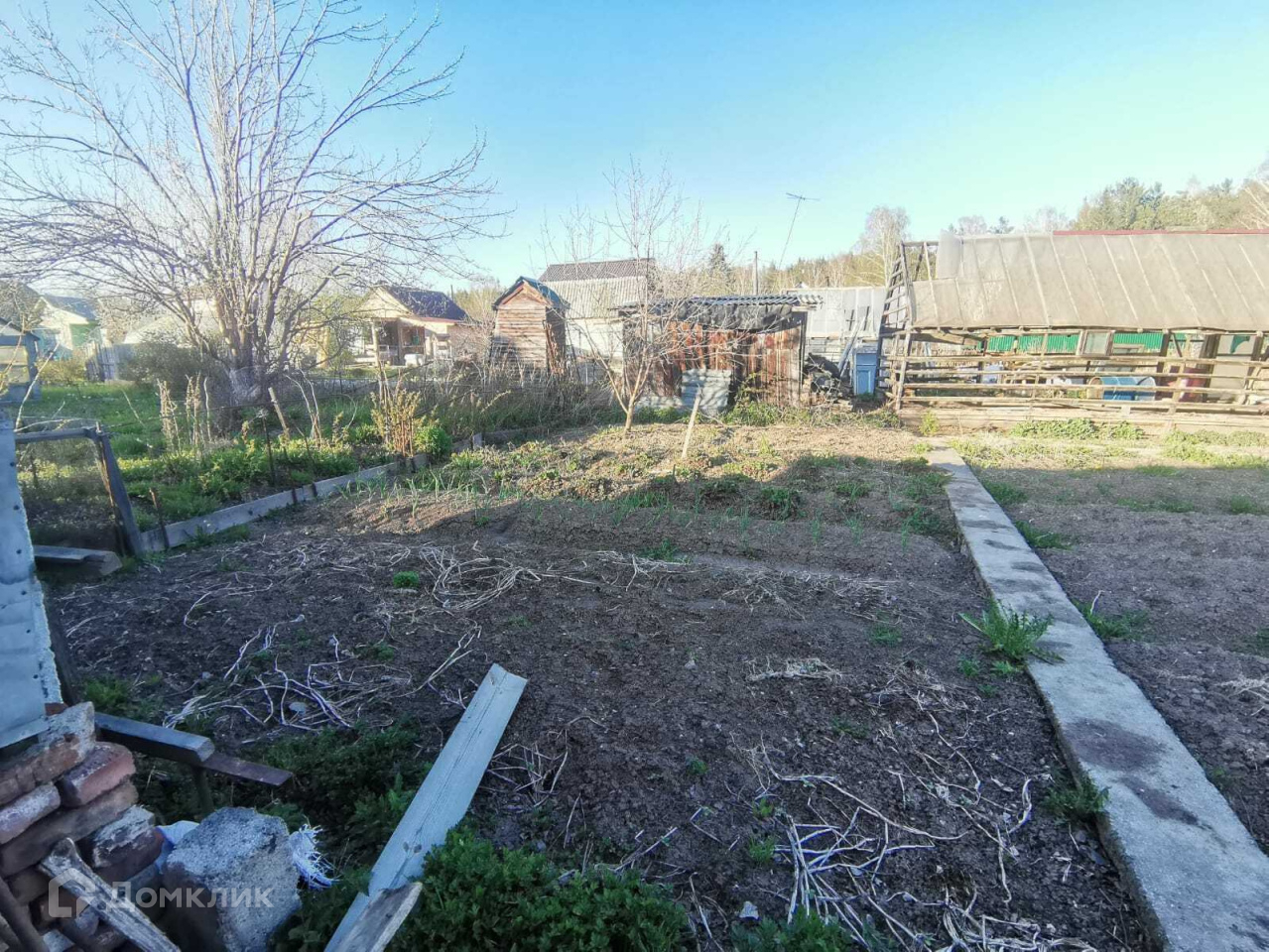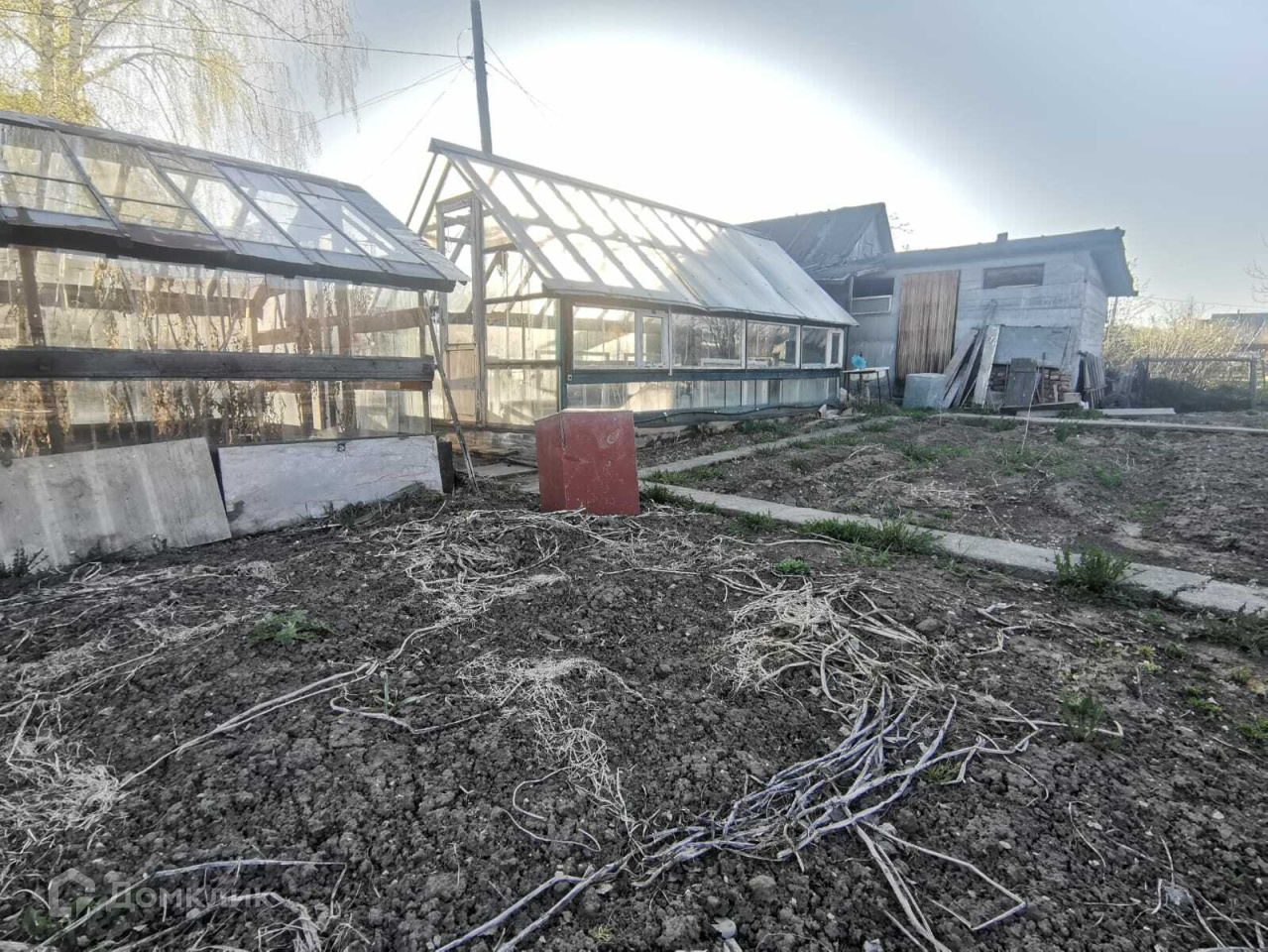 На участке 2 теплицы, яблоня, кусты смородины, крыжовника и малины.