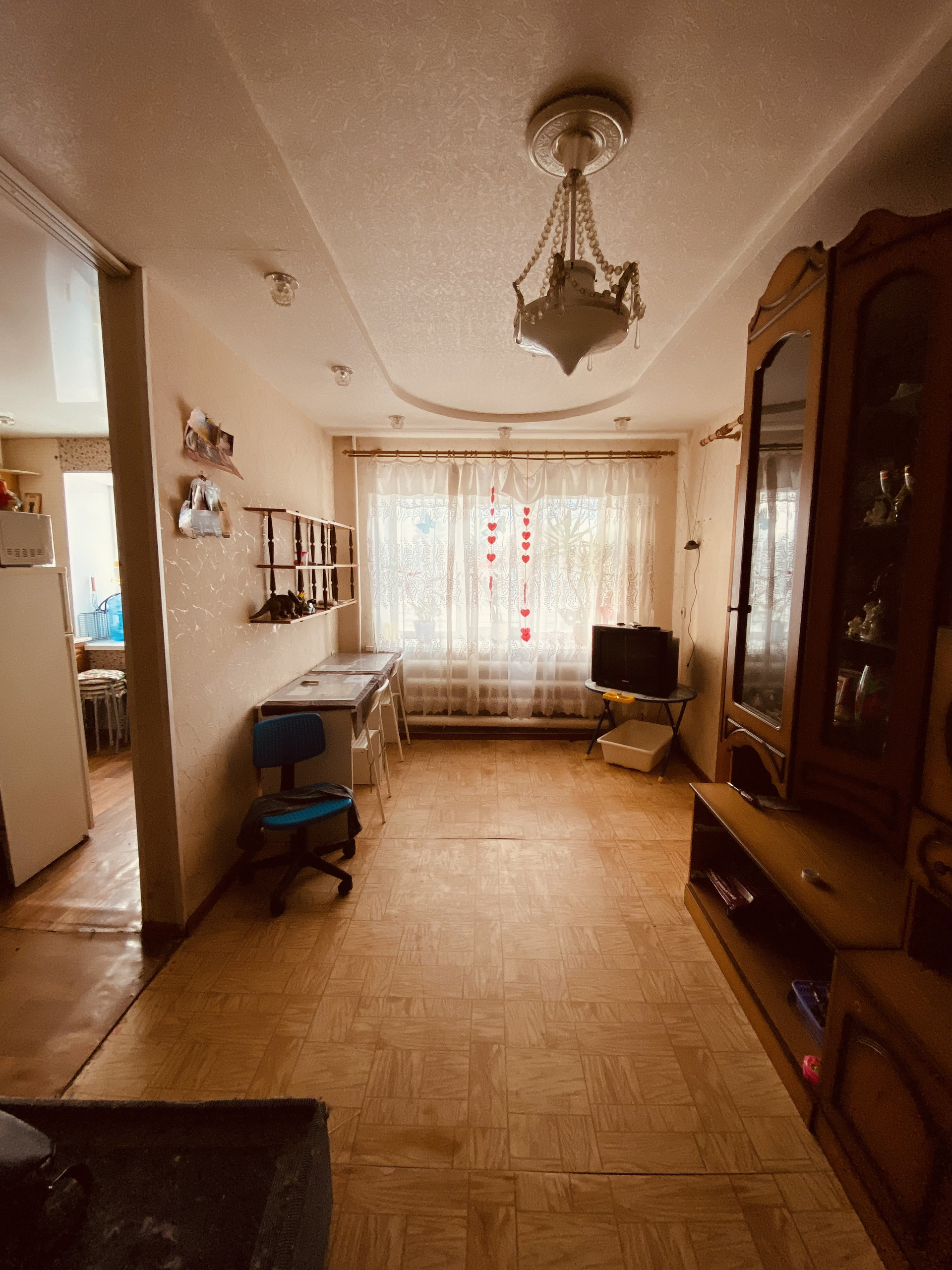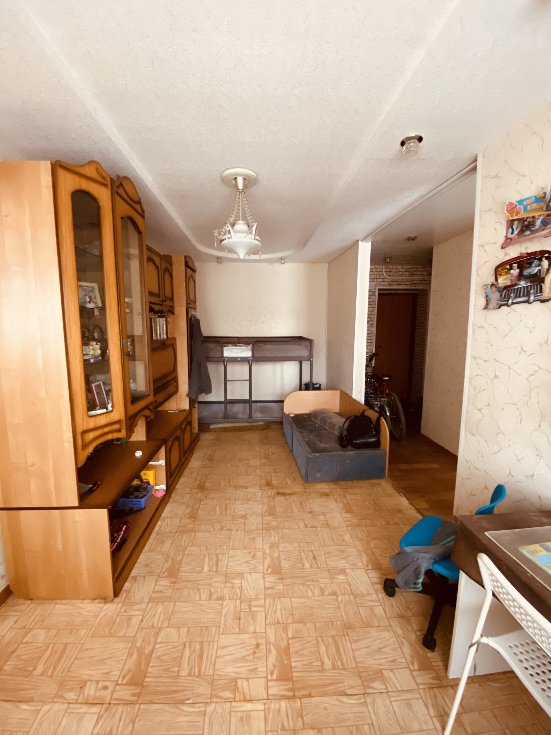 Окна заменены на пластиковые. На полу по всей квартире линолеум.