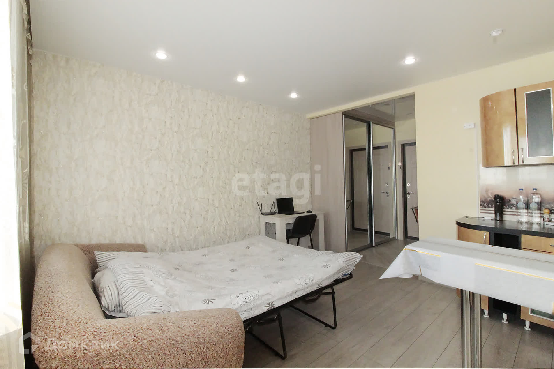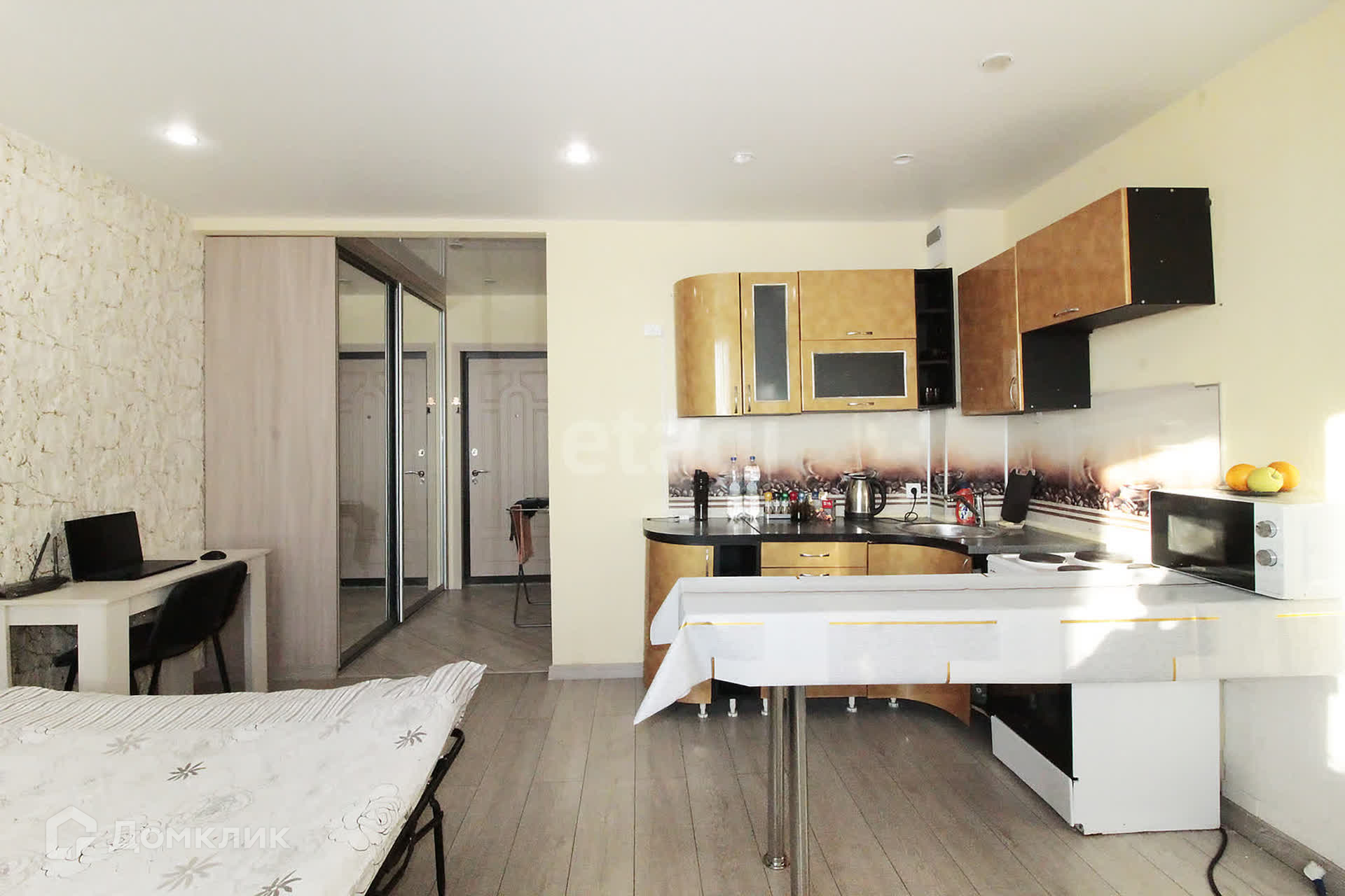 Предлагаем вашему вниманию отличную квартиру студию со свежим ремонтом и обстановкой в связи переездом. В квартире остаётся шкаф-купе под потолок, диван, кухонный гарнитур, холодильник, барная стойка.