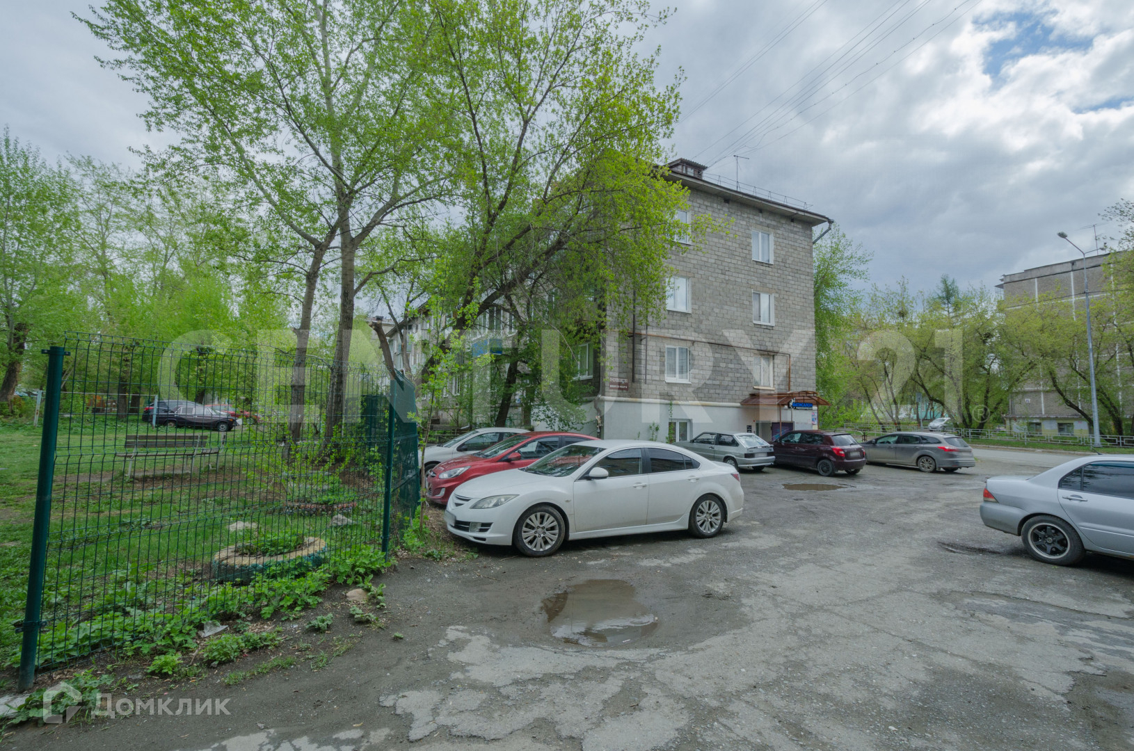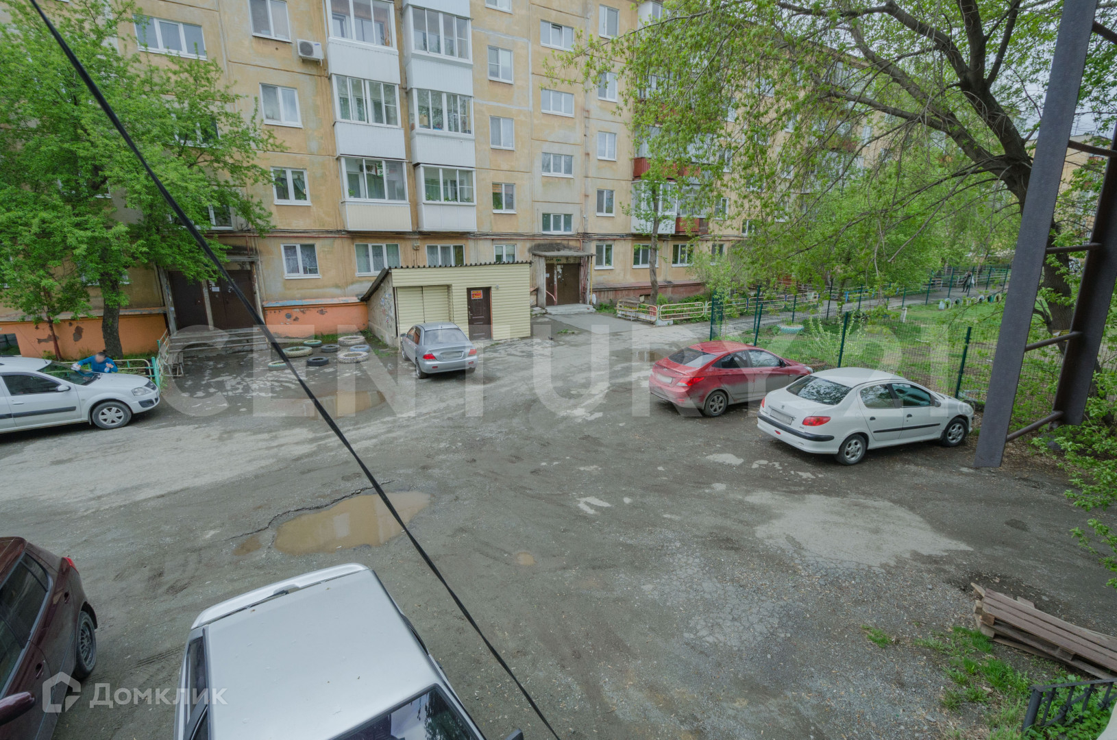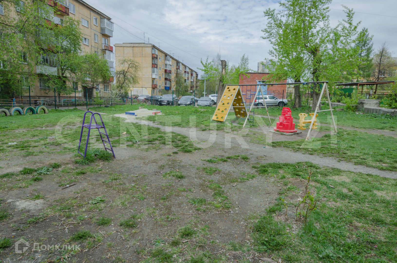 Во дворе огороженная детская площадка.