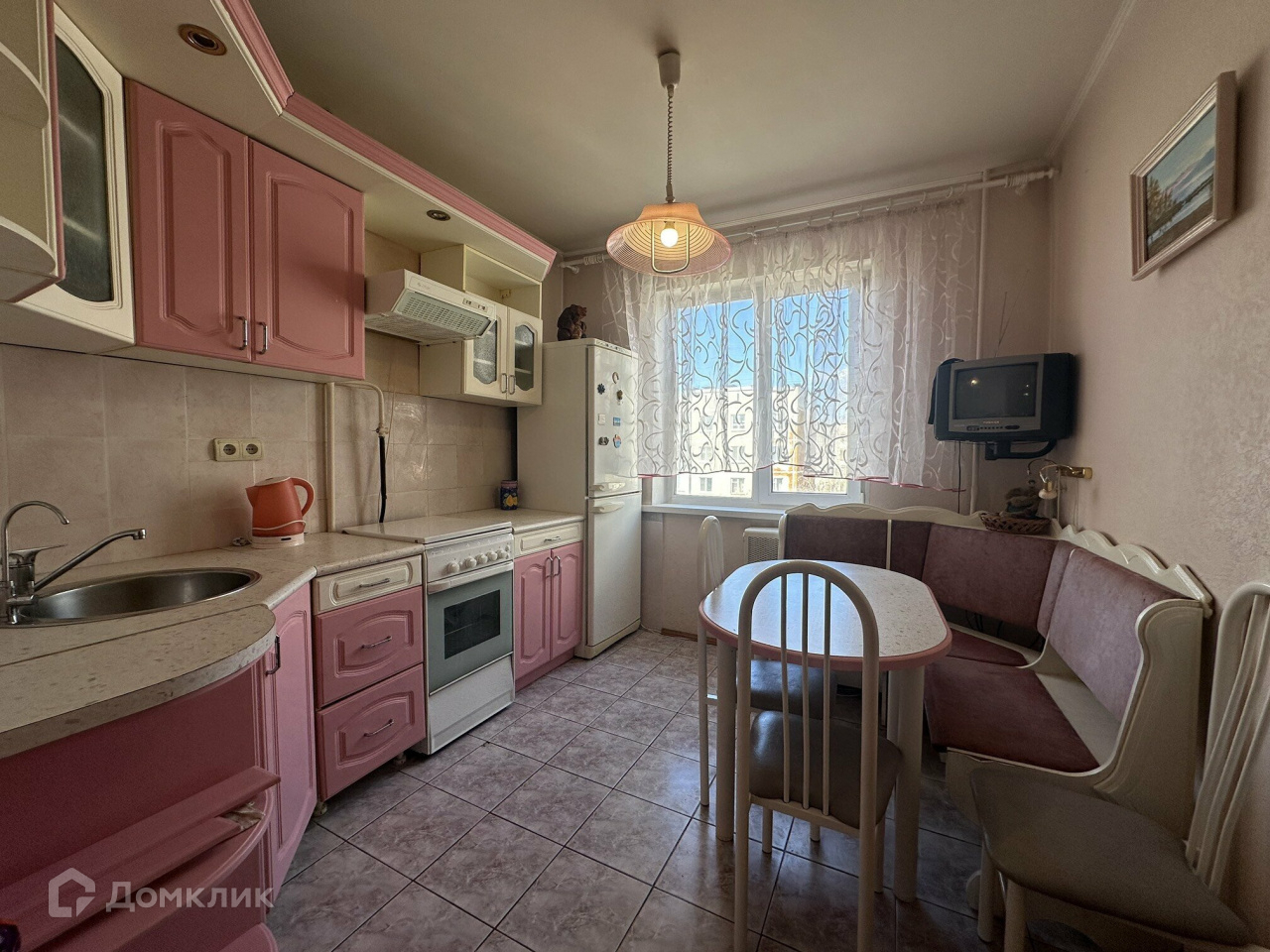 Квартира сдается с мебелью: Мебельная горка, диван, спальный гарнитур со шкафом, компьютерный стол со шкафом купе, кухонный гарнитур с газовой плитой и вытяжкой, стол и стулья. Стиральная машина, холодильник, телевизор на кухне. Шторы, люстры.