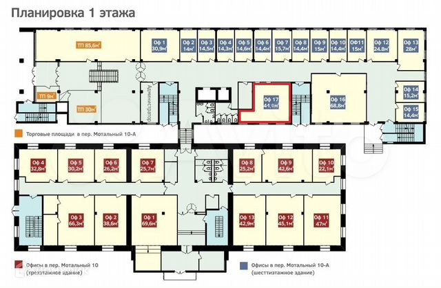 Ленинский р-н., Мотальный пер. 10, "Сдаю в аренду офис 44,1 м2 в Ленинском районе. 1 этаж бизнес центра. 1 кабинет с 3 окнами, сан. узел на этаже.  2 лифта, в здании работает кафе. Охрана на входе, видеонаблюдение. Парковка, 4 провайдера. Договор с ИП, УСН. Дополнительно э/э - по счетчику.", N103096