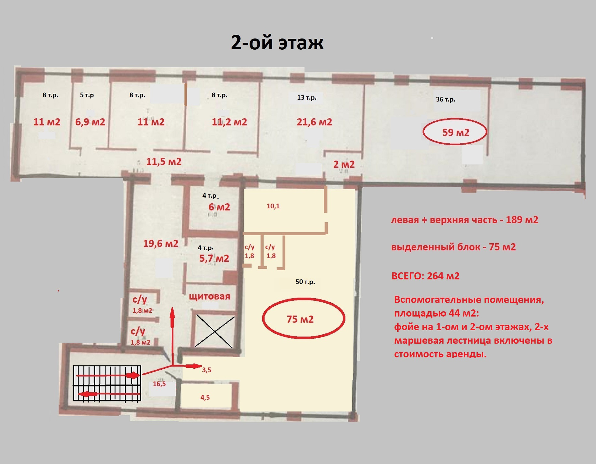 Сдается, с 01 мая, в аренду помещение свободного назначения, площадью 264 м2, расположенное на 2-ом этаже двухэтажного административного здания на ул. Богородского, недалеко от пл.Советской. Помещение представляет собой выделенную (отдельную) группу помещений различной площади (см. план) и имеет отдельный вход с улицы. Данная группа помещений по желанию арендатора может быть разделена на два отдельных блока, площадью 189 м2 и 75 м2. Мебель на фото – собственность арендатора, который съезжает. Комнаты светлые: всего 12 окон, на полу – плитка керамогранит, над потолком проходит вытяжная вентиляция, 4 отдельных санузла. В наличии: интернет, охранная и пожарная сигнализация. Предпочтение отдается одному арендатору, но рассматривается возможность аренды отдельных помещений. Стоимость аренды всей группы помещений, площадью 264 м2, – 132 тысячи рублей, дополнительно оплачиваются потребленная электроэнергия и вода по счетчикам. Стоимость аренды отдельных помещений – договорная. Собственник – ИП (УСН). Тихое, спокойное место, имеются места для стоянки легковых машин. БЕЗ КОМИССИИ ДЛЯ АРЕНДАТОРА!