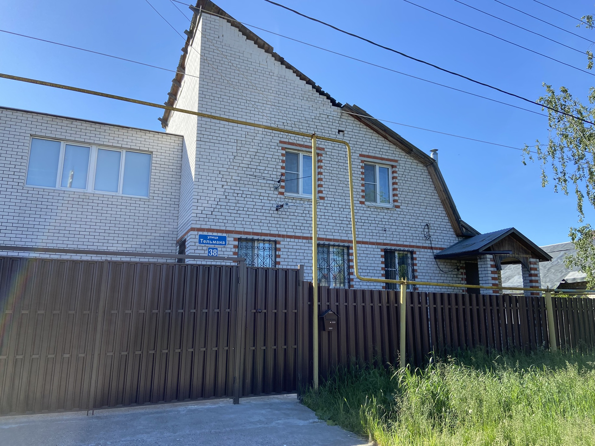По передней части дома новый забор, калитка и ворота. Во дворе плодовые деревья, большой мангал.