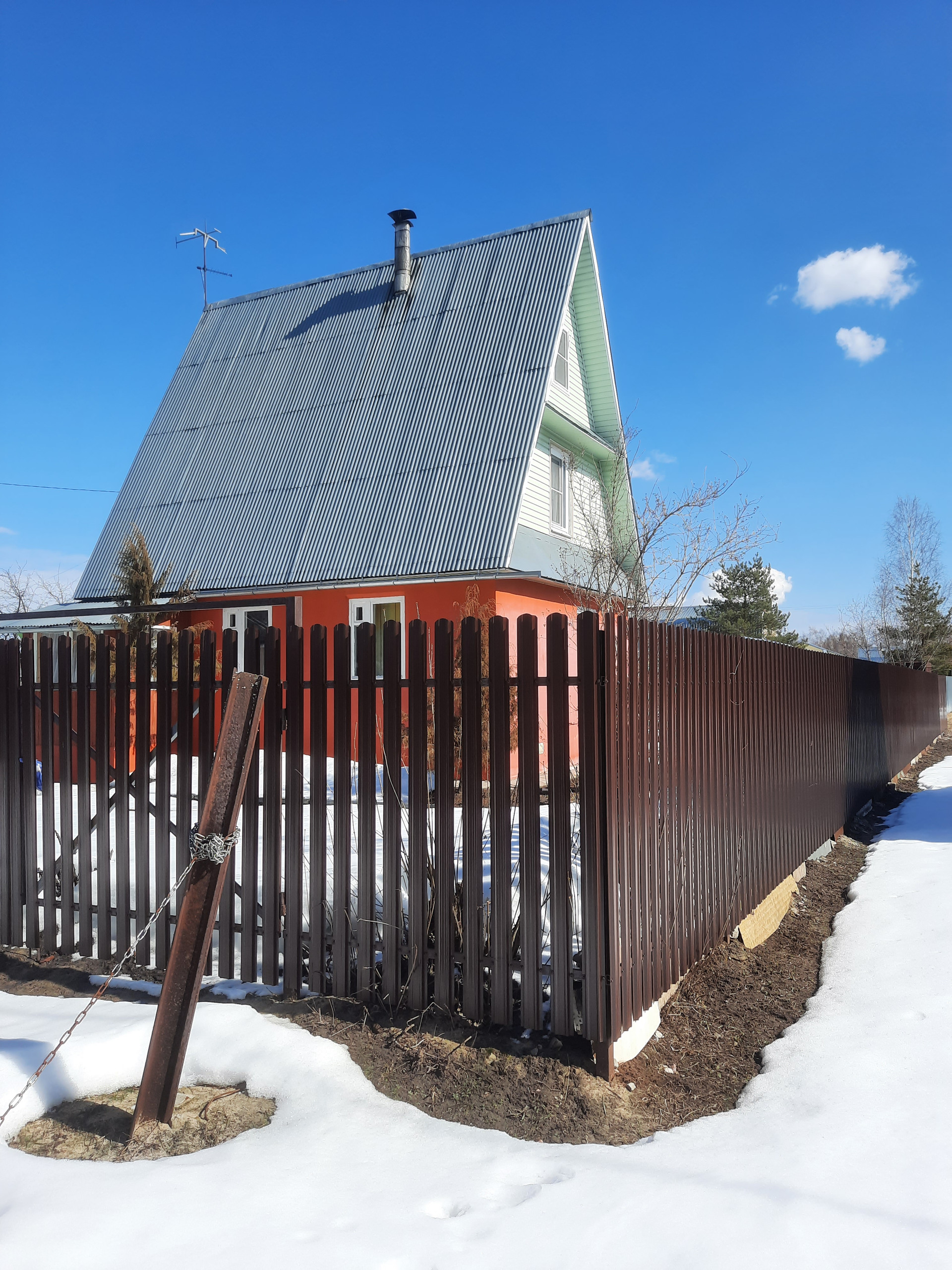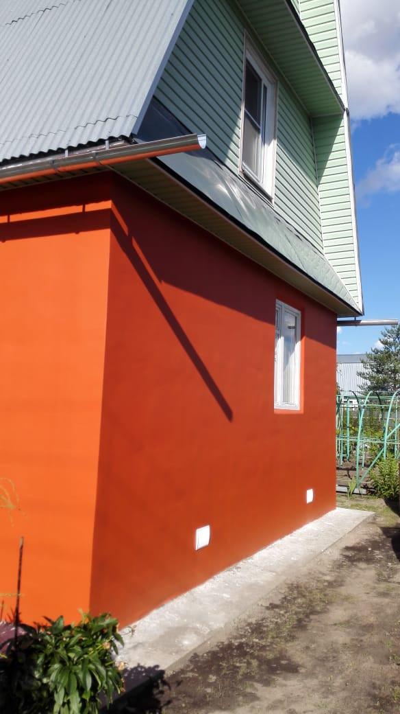 Стены дома из кирпича, с наружи поштукатурены и покрашены, крыша металлическая из профнастила. Вокруг дома выложена отмостка. Участок огорожен забором из металлического евроштакетника.