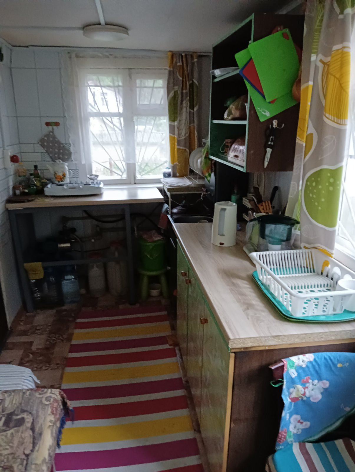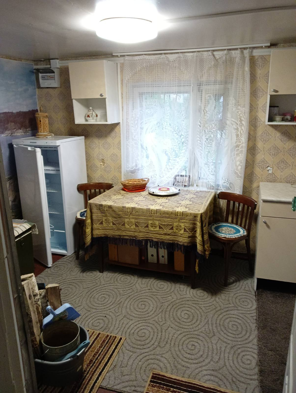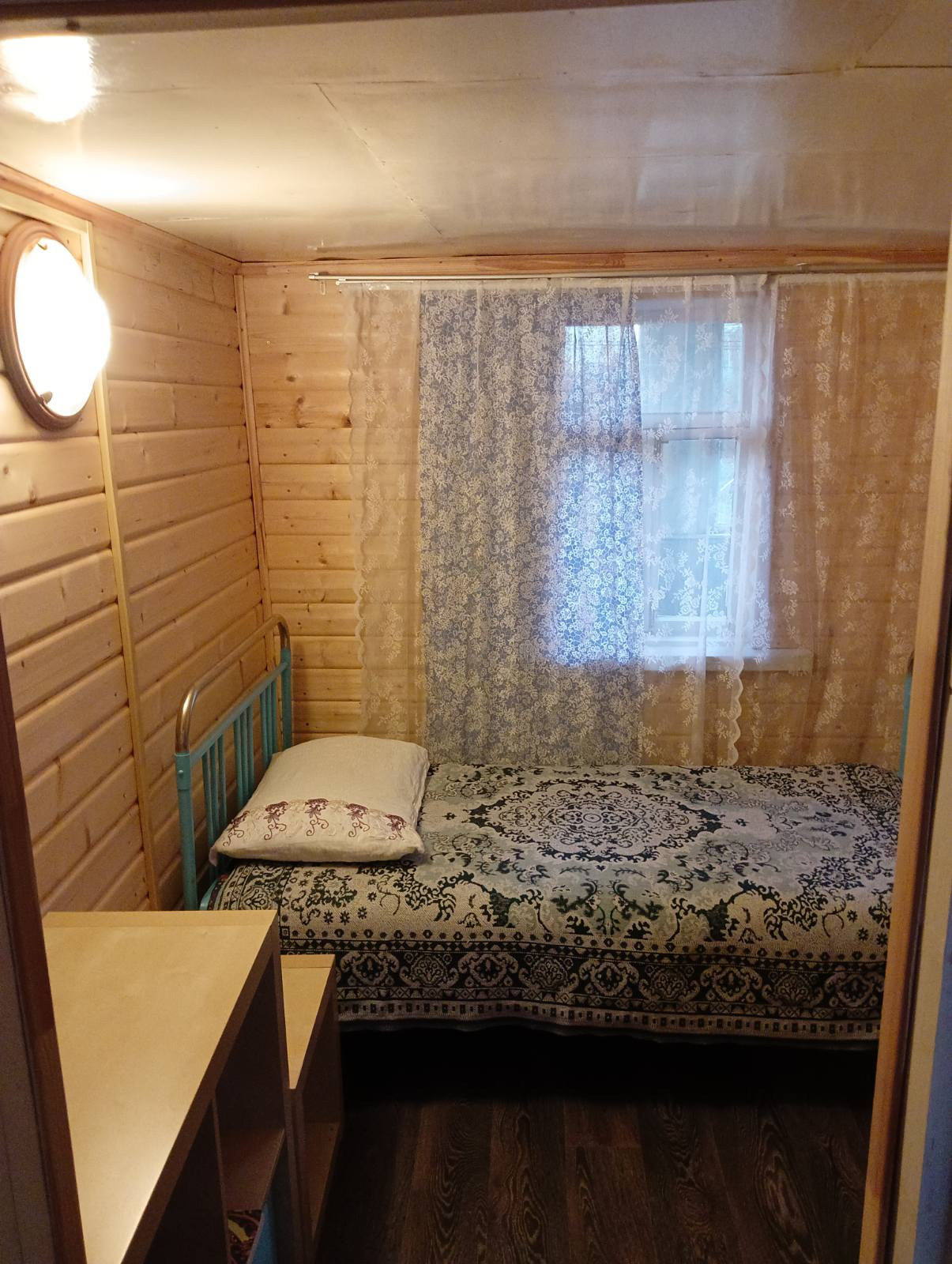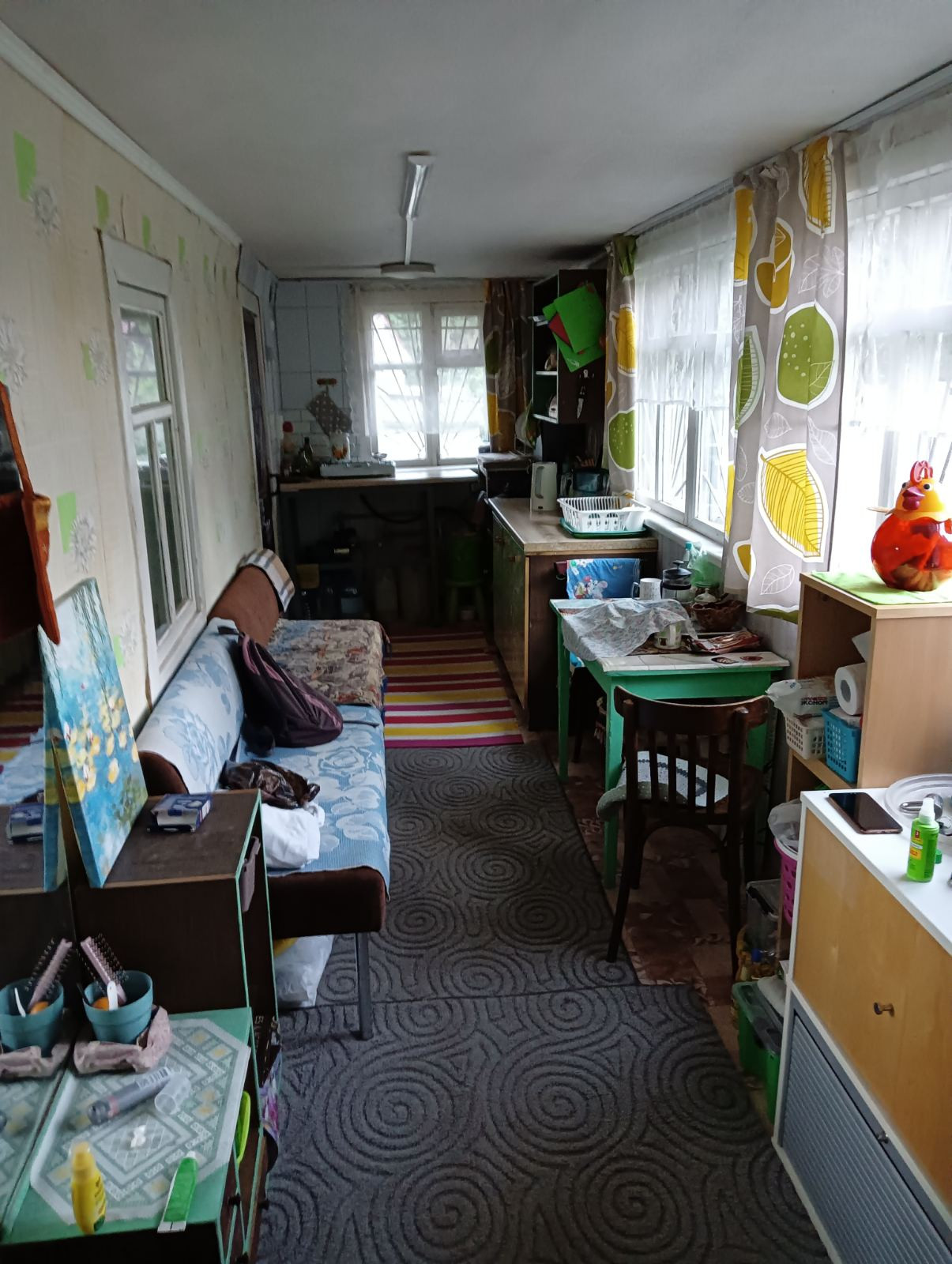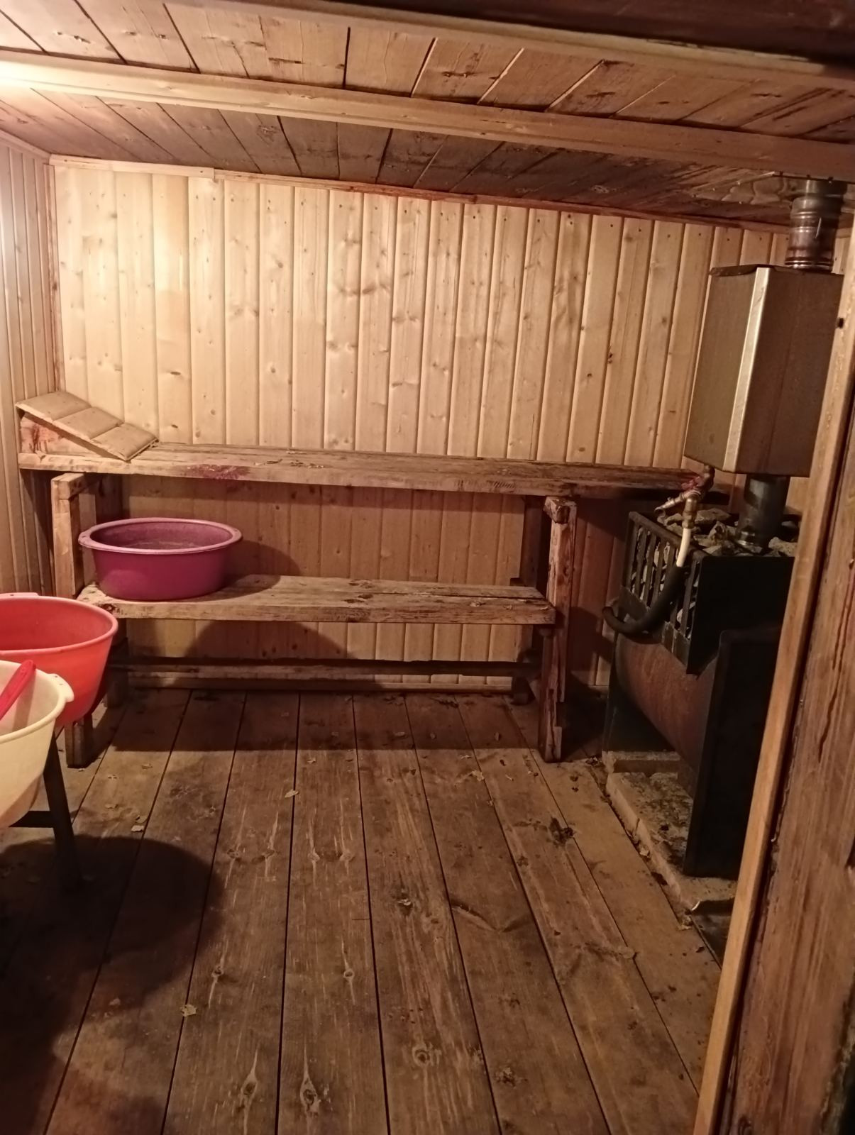 Дом крепкий 2-х этажный: 1-кирпич, 2 –дерево. На первом этаже 2 комнаты, печь-плита, большая закрытая веранда. На втором этаже две комнаты, две кладовые с двумя входами. Вдоль всего этажа – лоджия. Коммуникации в доме: электричество и вода из скважины. Новая электропроводка. Есть погреб для хранения заготовок. На участке: баня бревенчатая, с хорошим ремонтом и новой печкой и баком, подведена вода. Напротив бани - душевая кабина и туалет.