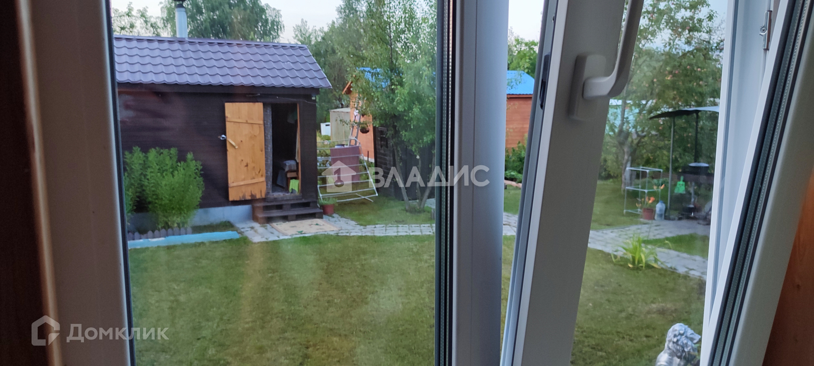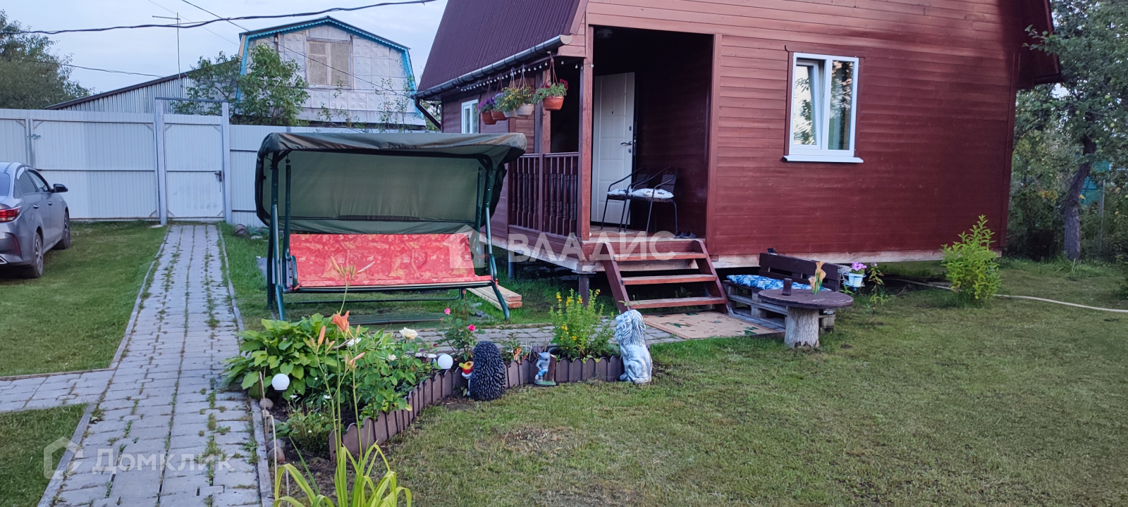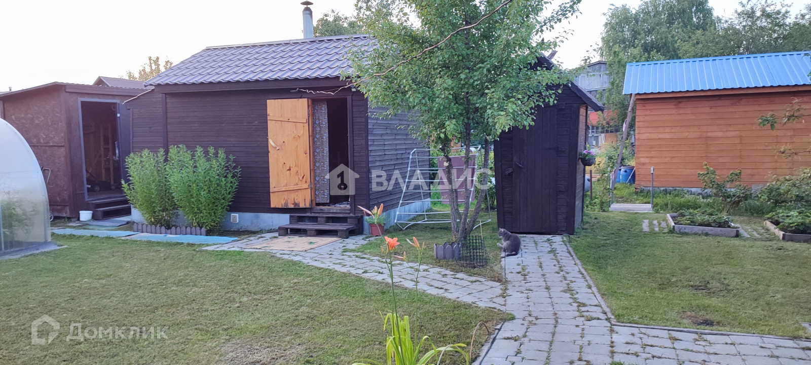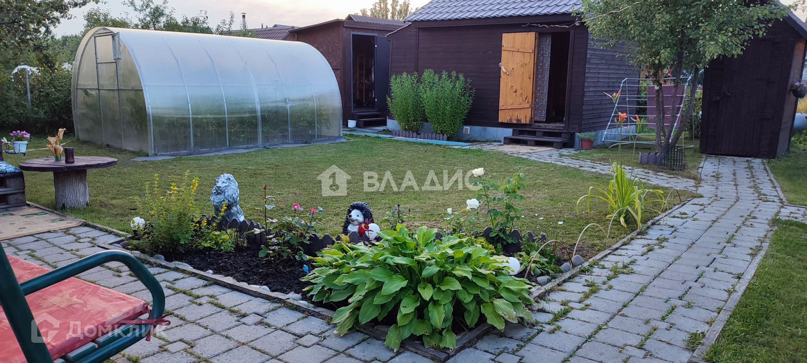 По всей территории участка дорожки из брусчатки,газонная травка,имеются плодовые деревья( яблони,груша.вишня) и кустарники( смородина,виноград), цветник.