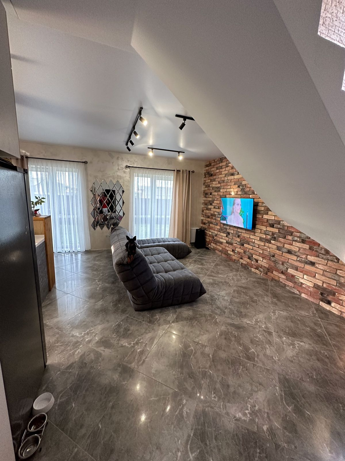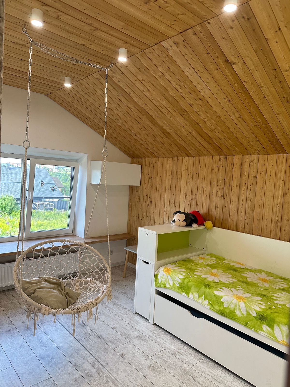 Планировка: 1 этаж - просторная кухня-гостиная с двумя панорамными окнами, санузел 1го этажа, гардероб; 2 этаж - 3 спальни и санузел 2го этажа.