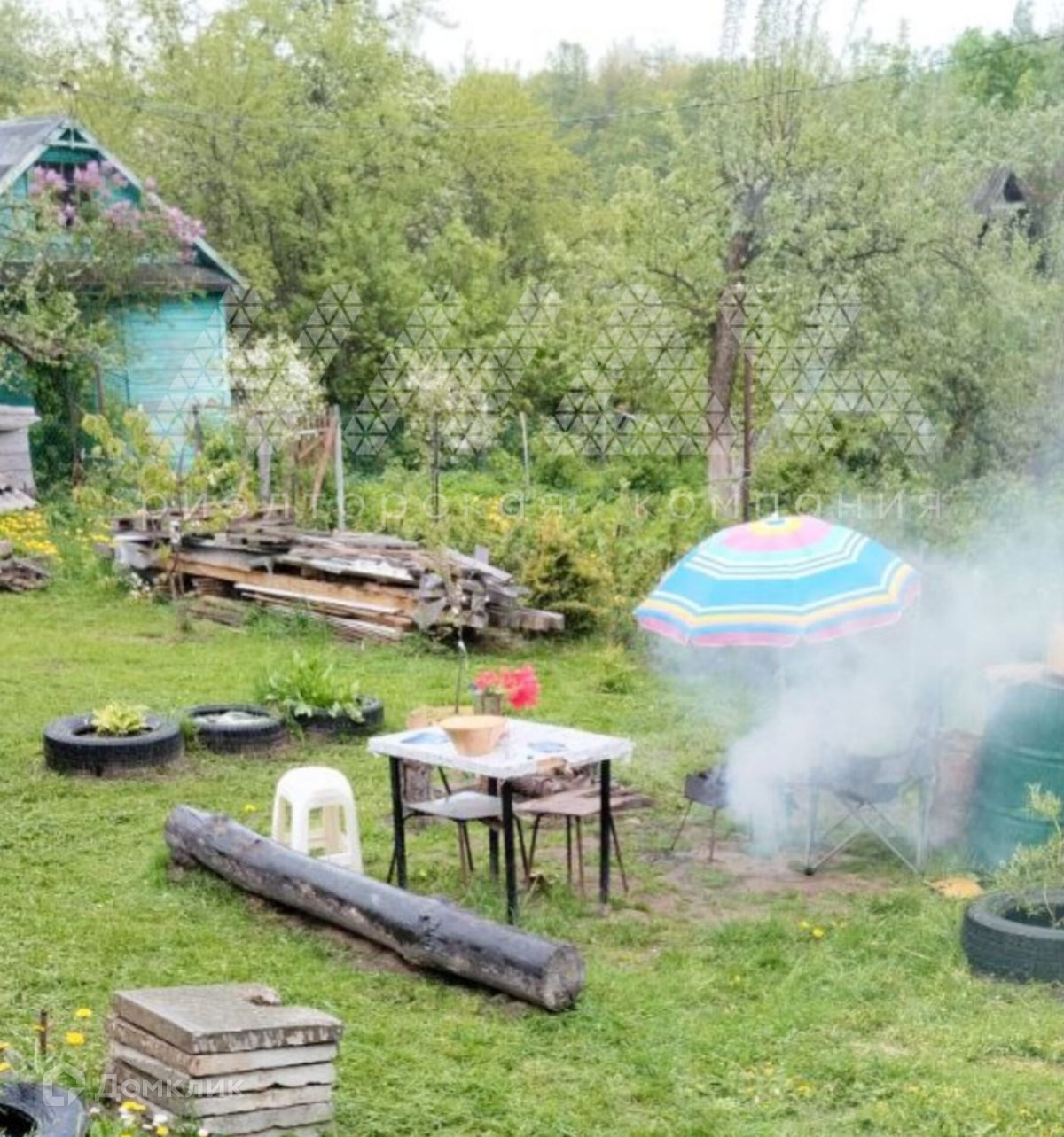 Участок ухоженный, посеян газон. Растут: 2 яблони, 2 черешни, смородина, машина, клубника и земляника плодоносят до октября.