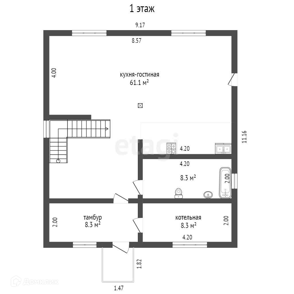1. Первый этаж/котельная/тамбур/ванная/кухня-гостинная;
