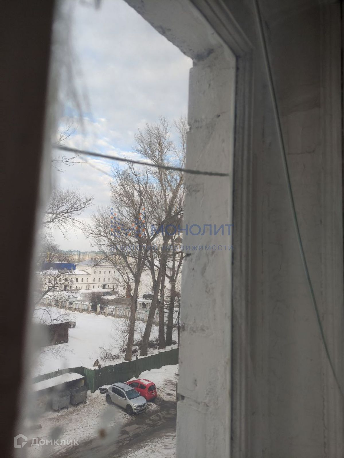 Комната небольшая, но очень теплая, что очень важно при наших зимах. Окно выходит во двор, из окна видно Староярмарочный собор. Под окном имеется место для парковки.