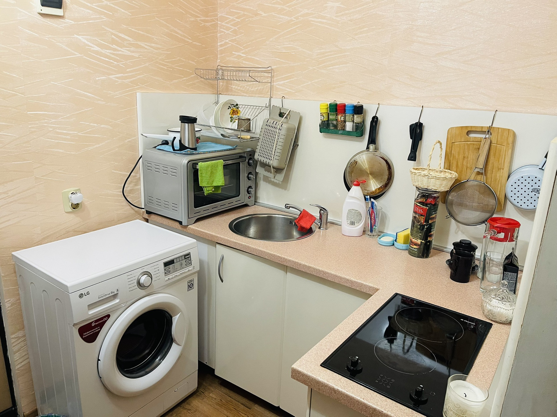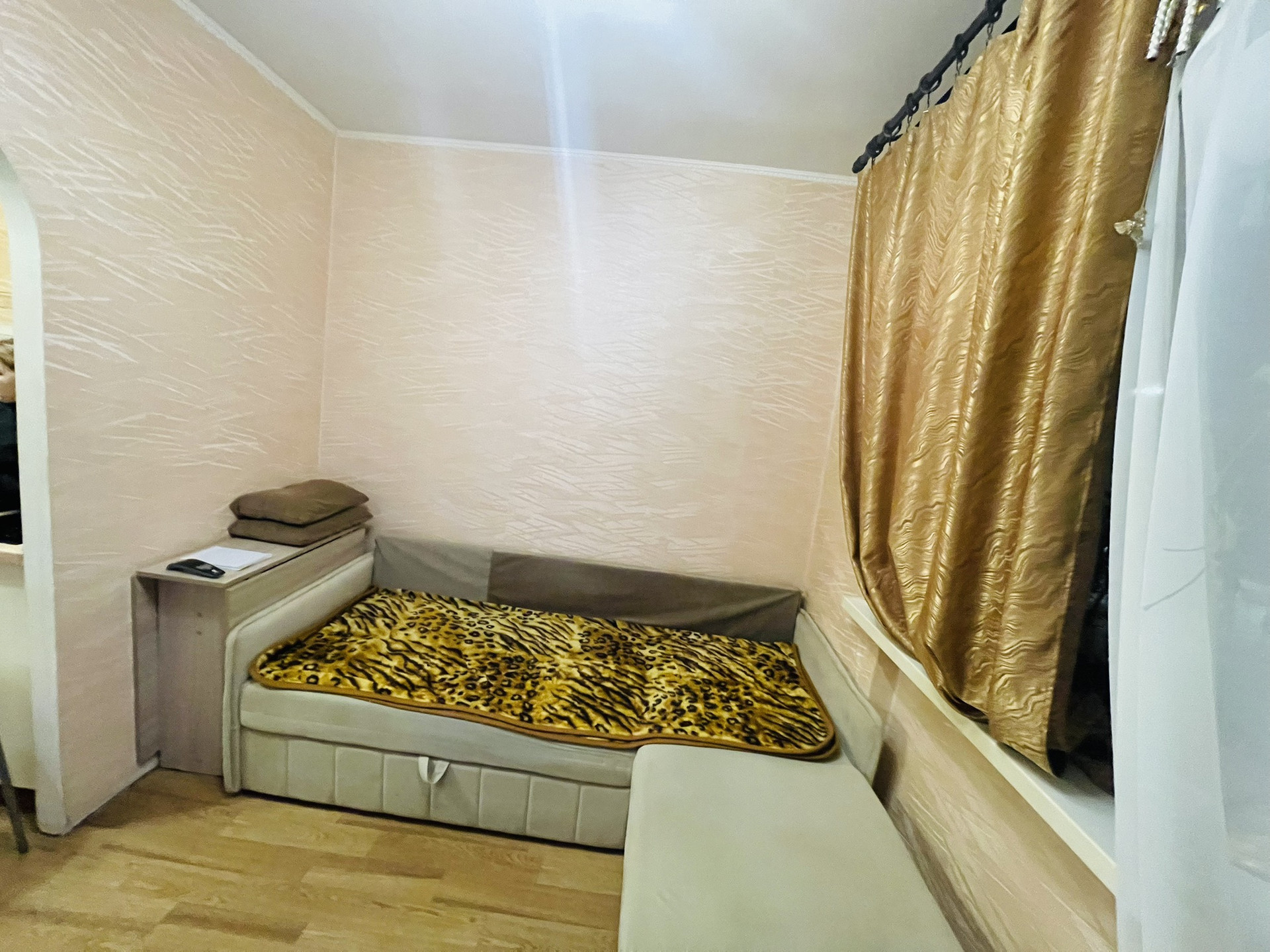 Пластиковое окно, линолеум на полу, проведена вода в комнату,хорошая входная дверь, кухонный гарнитур и шкаф остаётся в подарок.