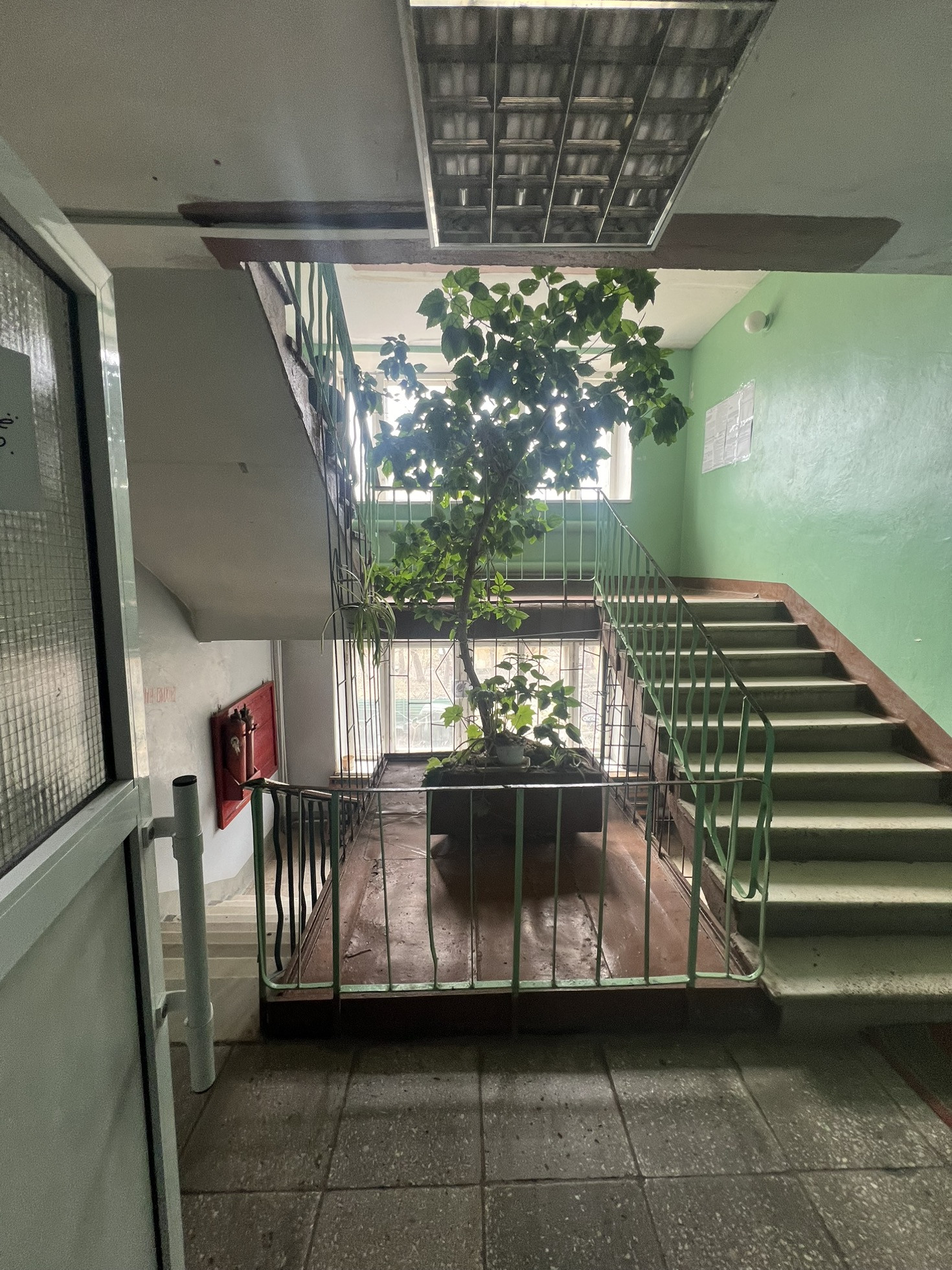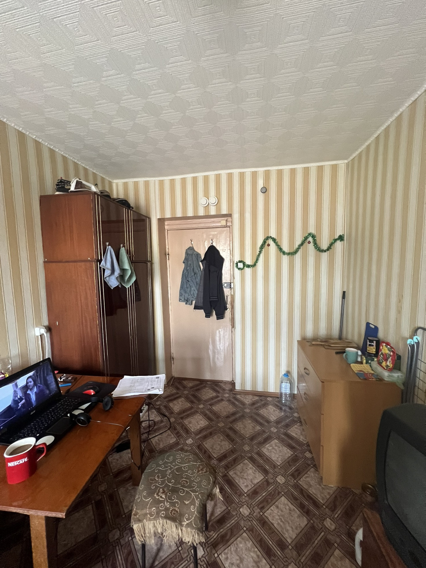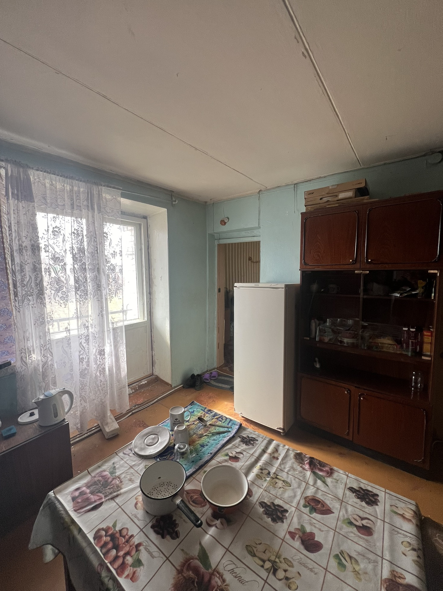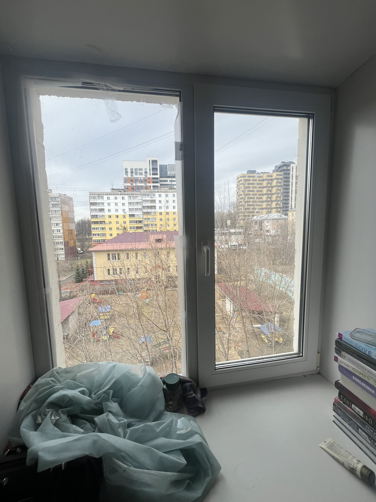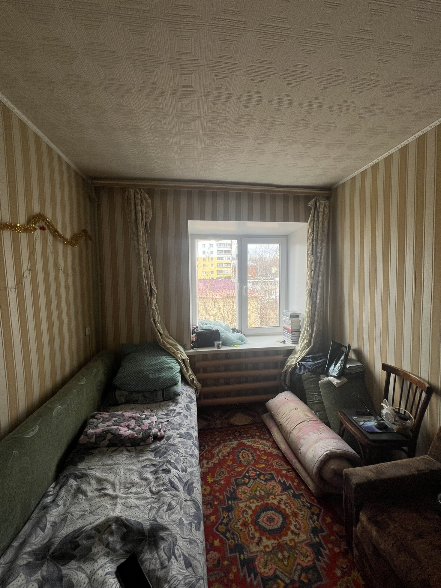 В комнате установлено пластиковое окно на западную сторону с видом на детский сад.