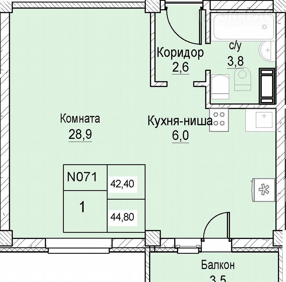 Общая площадь 42.4 м2